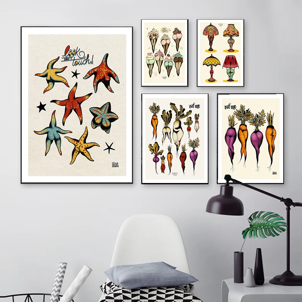 Забавный абстрактный постер на холсте с изображением грибов, моркови, ягодиц с сексуальной женщиной, ног, винтажная картина на стену для спальни, домашний декор