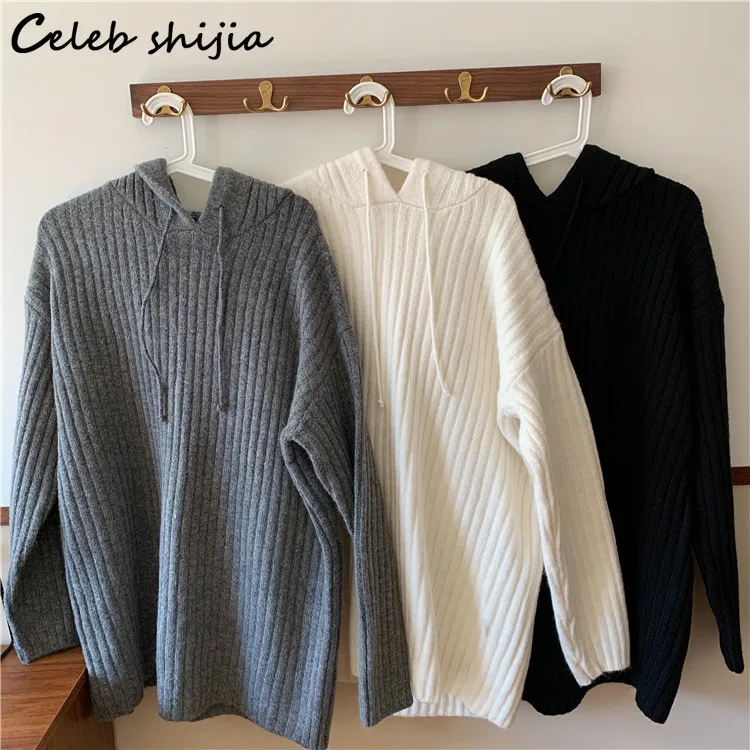 Длинный свитер SHIJIA абрикосового цвета, женская одежда в уличном стиле, вязаный джемпер в Корейском стиле с капюшоном, женские свободные пуловеры с длинным рукавом для осени