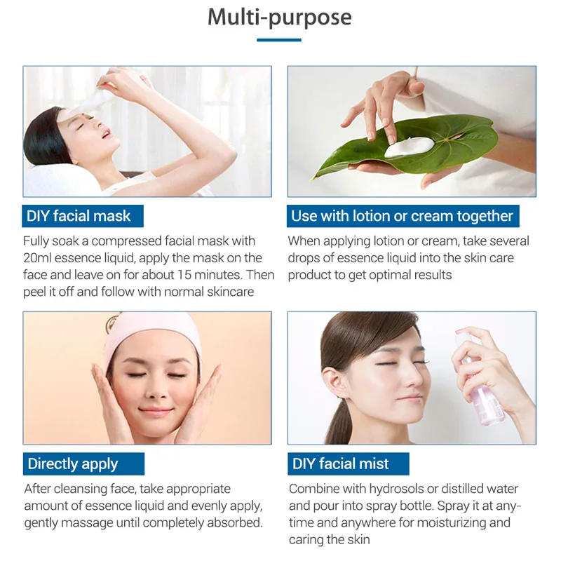 1. Маска для лицаПолностью Замочите сжатую маску для лица с жидкостью эссенции 20 мл, нанесите маску на лицо и оставьте на около 15 минут. Затем снимите ее и следуйте обычным мерам по уходу за кожей.2. Используйте вместе с лосьоном или кремомПри нанесении лосьона или крема, возьмите несколько капель эссенции жидкости в продукт по уходу за кожей, чтобы получить оптимальные результаты.3. Непосредственно применяетсяПосле очищения лица принимайте необходимое количество жидкой эссенции и равномерно наносите, мягко массируйте до полного впитывания.4. Сделай Сам туман для лицаКомбинируйте с гидросолями или дистиллированной водой и залейте в распылительную бутылку. Распылите его в любое время и в любом месте для увлажнения и ухода за кожей.