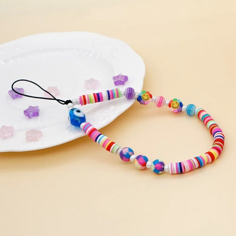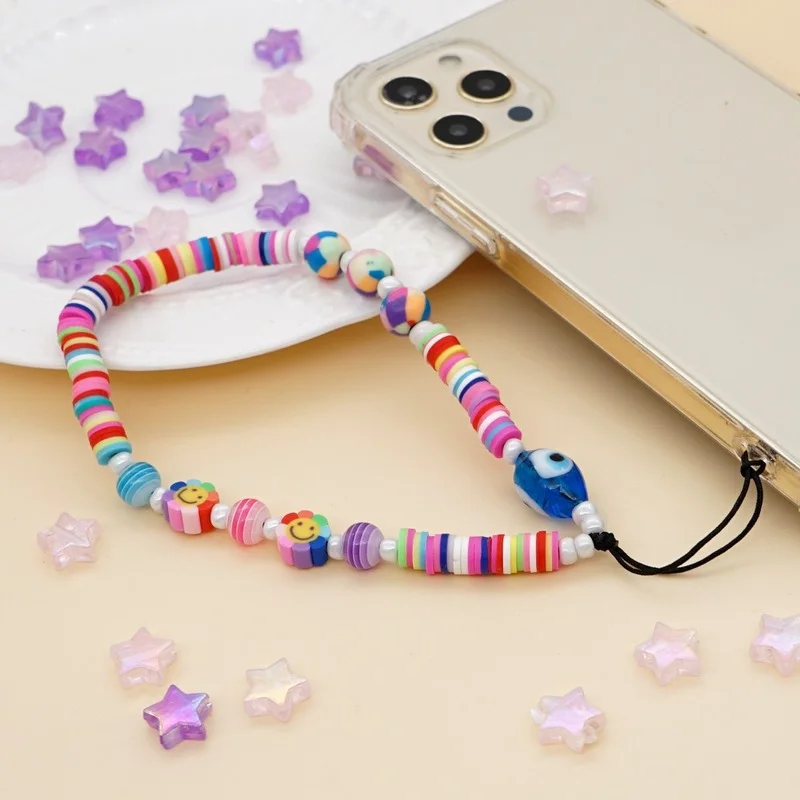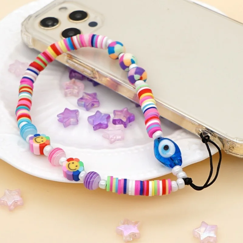 Цепочка с бусинами, в богемном стиле, разноцветная, из глины, со смайликами, злыми глазами, мобильный телефон