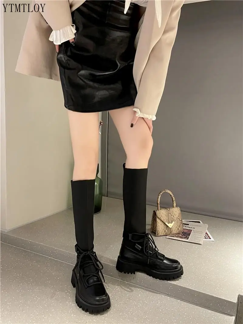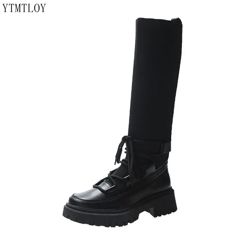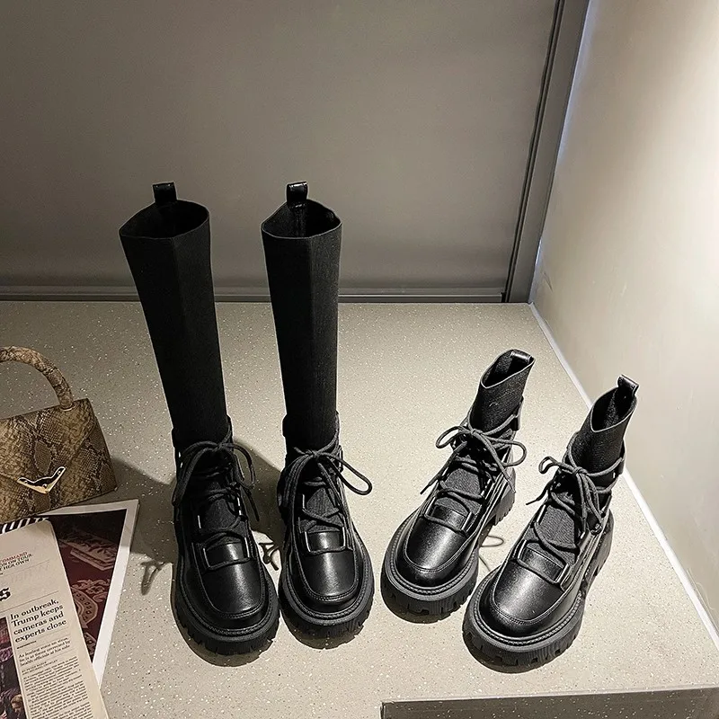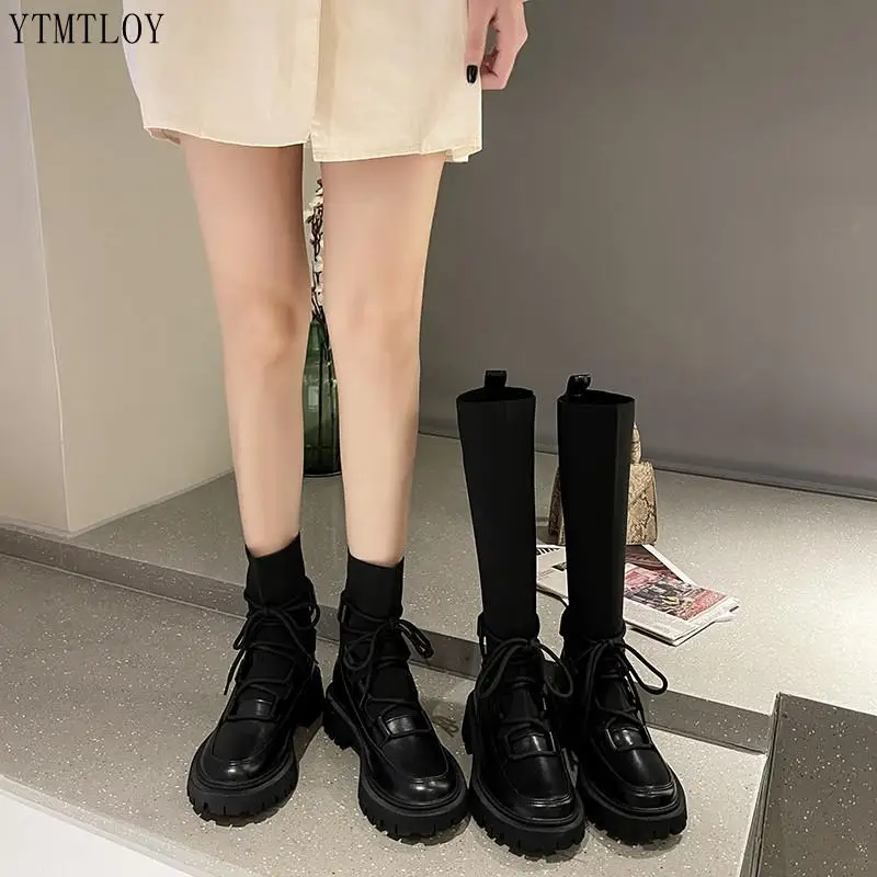 Женские ботинки-носки на платформе, черные эластичные вязаные ботинки в стиле панк и готика, с квадратным носком, на массивном каблуке, для верховой езды, 2022