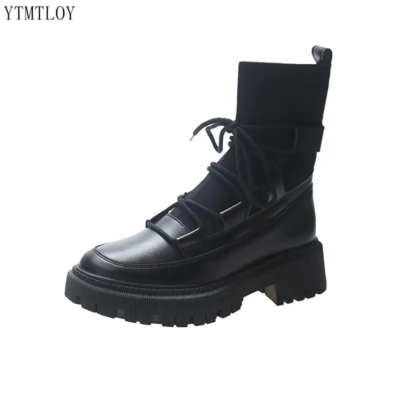 Женские ботильоны на платформе, Черные ботильоны на шнуровке, мотоц...