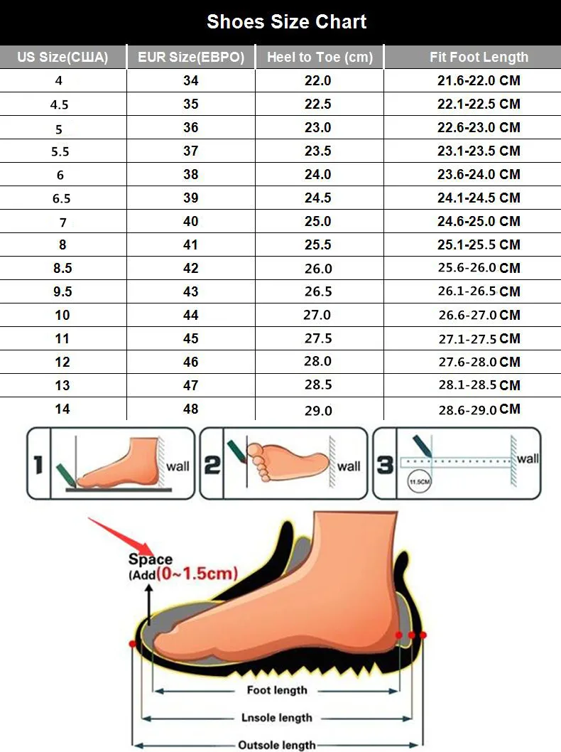 Найдите правильный размер:1. Пожалуйста, выберите размер в соответствии с длиной Вашей стопы.2. Если ваша стопа шире или толще, выберите на размер больше.3. Мы отправляем Размер согласно размеру ЕС, а не по размеру США.
