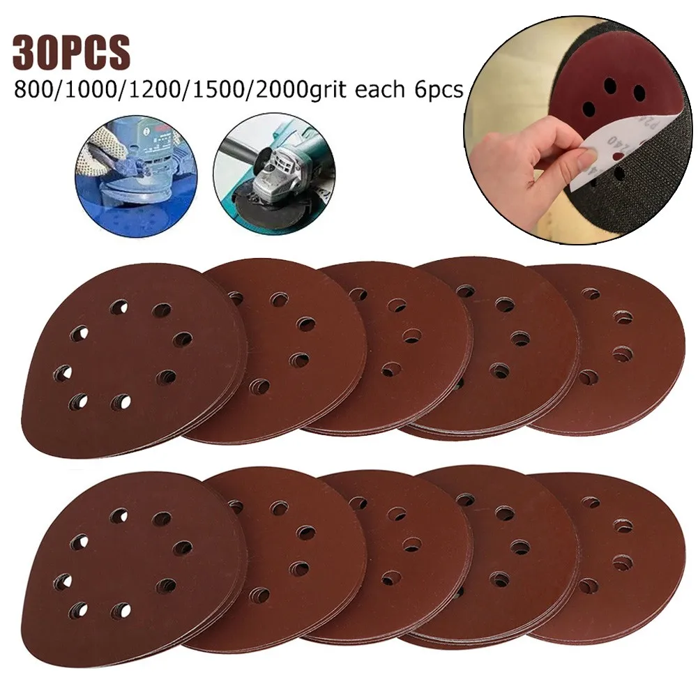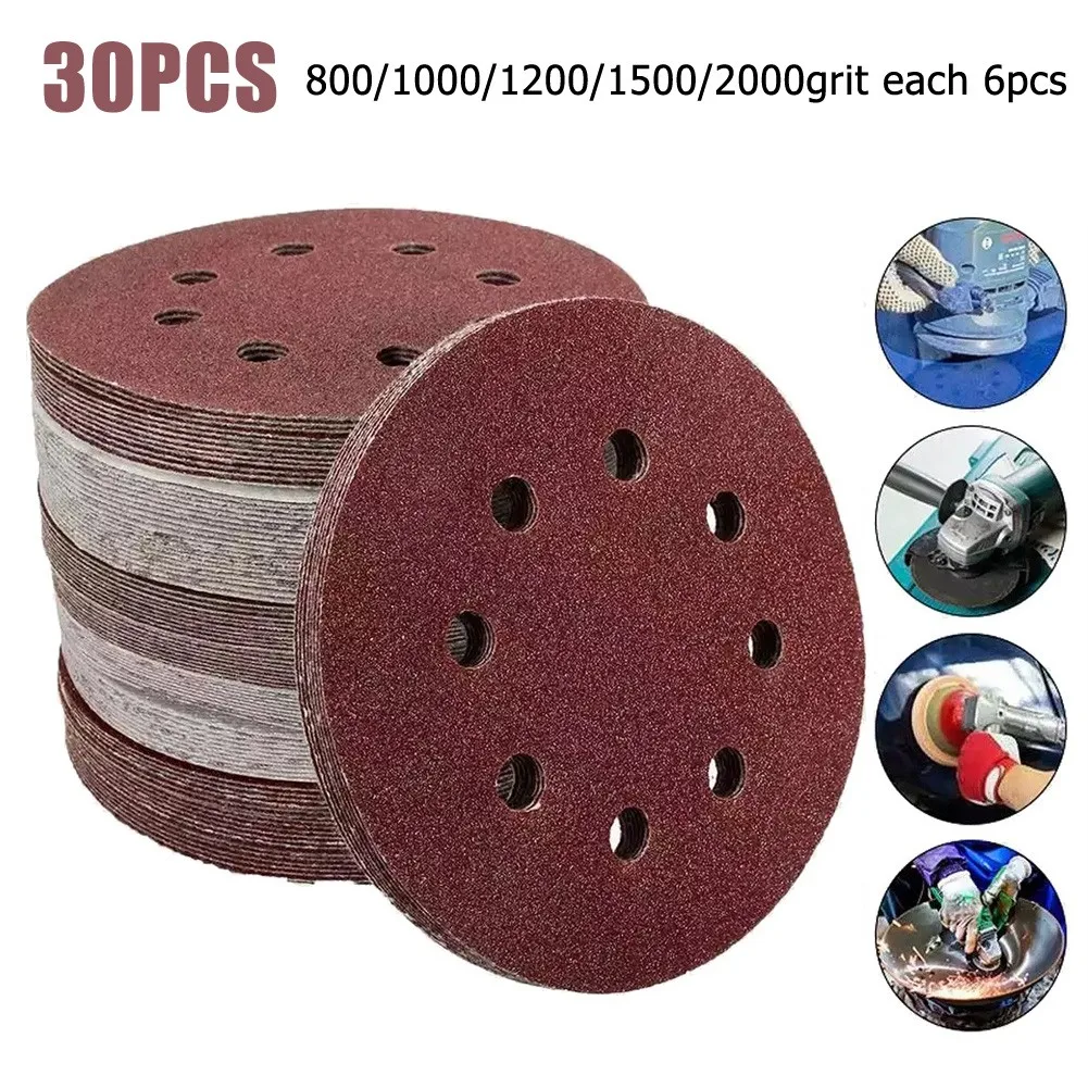 30 шт., Набор круглых шлифовальных дисков, 5 дюймов, 125 мм, 8 отверстий, 800-2000 дюйма