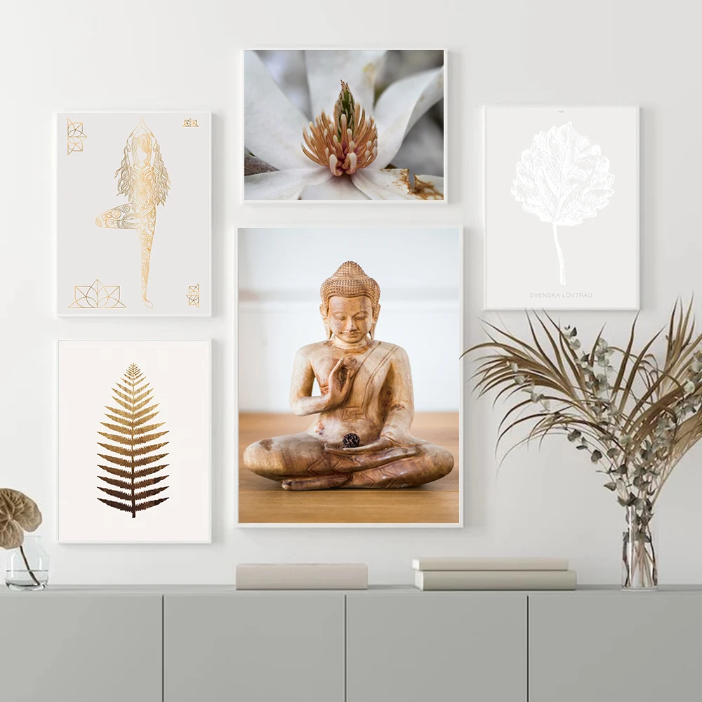 Плакат с изображением статуи Дзен Будды, Золотой лист, Йога, холст, минималистский цветок, настенная живопись, буддизм, Современный домашний декор