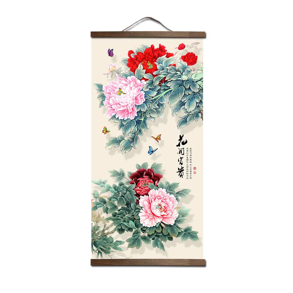Цветок в китайском стиле, зеленые растения, холст, декоративная картина для гостиной, настенное искусство, картина в свитке из массива дерева с рамкой
