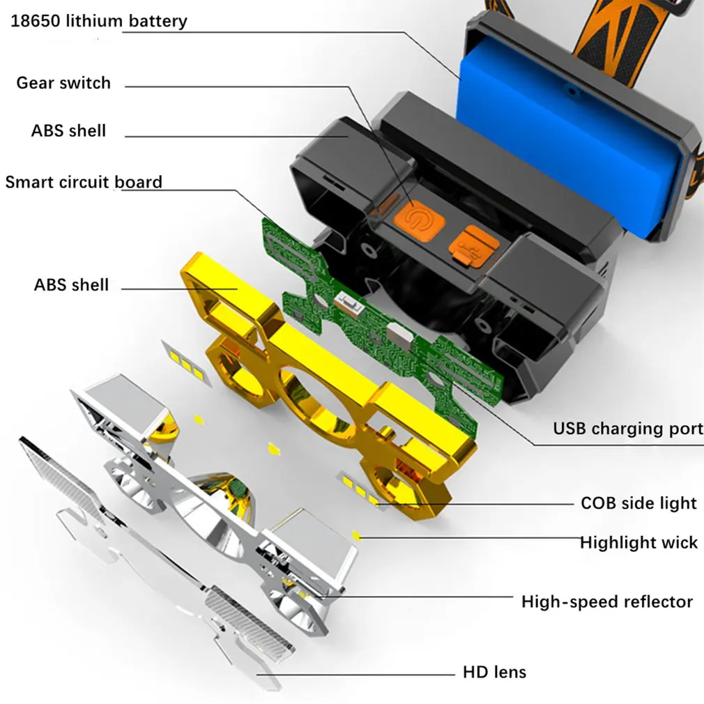 Светодиодный светильник, установленный на головке, обладает высокой яркостью и большим диапазоном, который может удовлетворить все жизненные потребности.