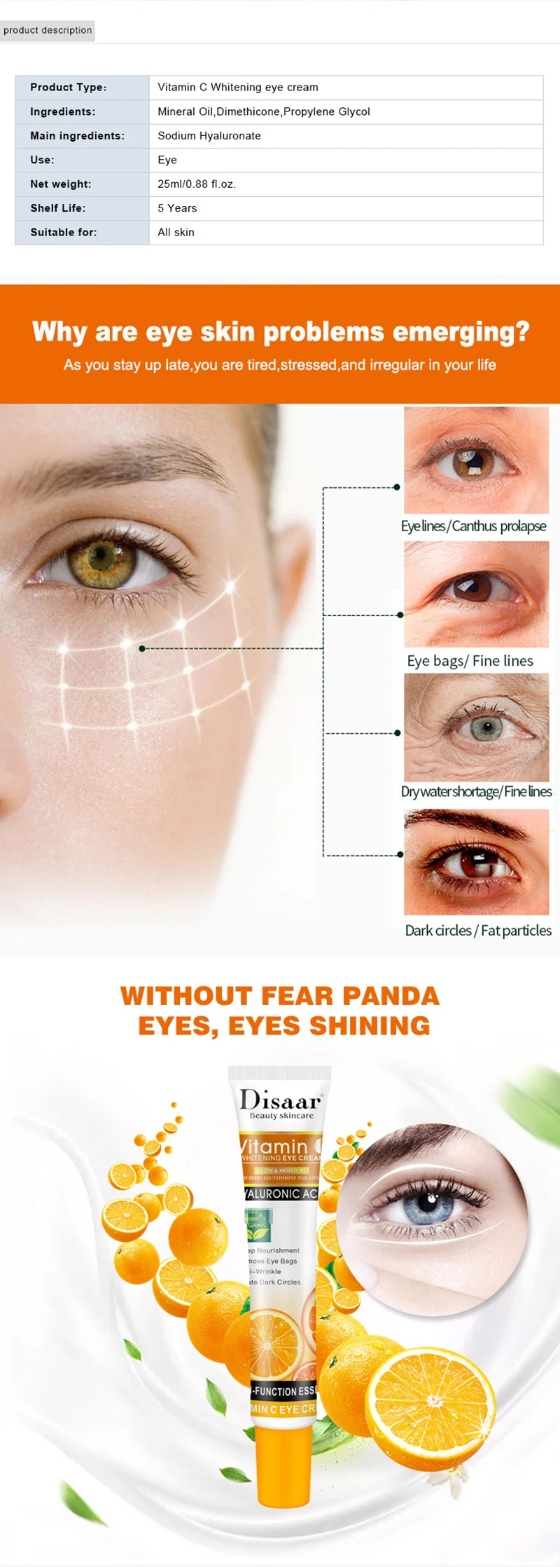 Название продукта: отбеливающий крем для глаз с витамином ССостав: минеральное масло, диметикон, пропиленгликольОсновные ингредиенты: гиалуронат натрияИспользование: глазВес нетто: 25 млСрок годности: 5 летПодходит для: любой кожи