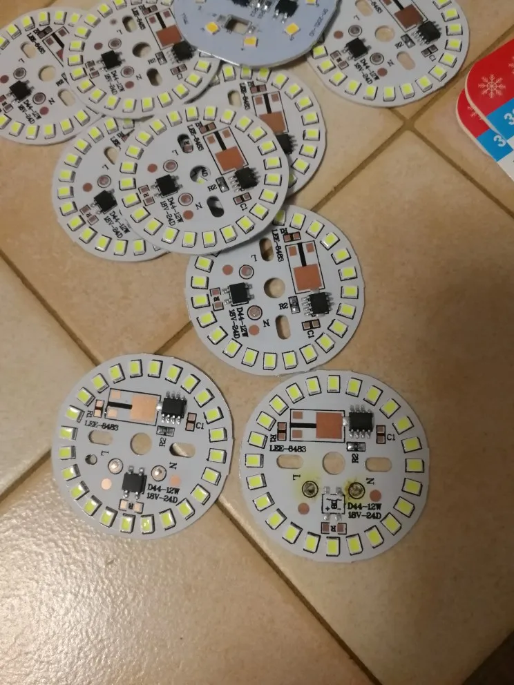 Заказал 15.10.21 10 штук 12W, а получил 29.10.21. С продавцом не общался. Платы все исправные, светят жёлтым цветом, примерно 2700 К. Плата сделана качественно, но толщина алюминиевого теплоотвода очень тонкая, <1мм. Считаю толщина платы недостаточная. Чипы smd2835, похожи производства Epistat, но это не точно, потому что нет маркировки и меток. Не соответствует описанию. Продавец заявляет, что мощность платы 12W, а на самом деле мощность потребления 8,5 W. Поэтому всего 3 балла. Прикрутил 3 платы по 12W, на алюминиевую пластину на термопасту, размером 180х180, толщина 6 мм. И смонтировал в большой круглый светильник диаметром 350 мм. Общее потребление всего 3*8,5=25,5W. Всего сделал 3 одинаковых светильника. Позже напишу, сколько прослужат.