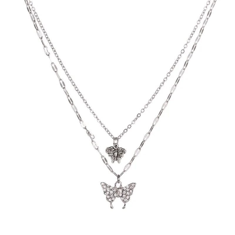 Женское двойное ожерелье с кристаллами и бабочкой, серебряного цвета