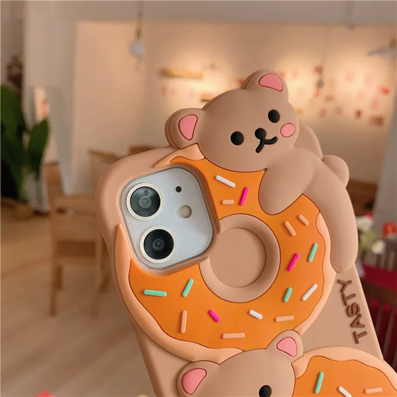 Мультяшные Милые 3D Подвески в виде медведей из ТПУ, телефонные чехлы для iPhone 8, 7, 6 Plus, SE2, X, XR, XS, 11, 12, 13, Mini Pro Max, Женский силиконовый чехол в виде пончика