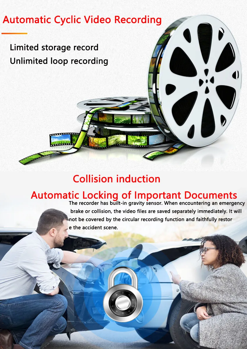 G-сенсор из-за технологии bulit-in G-sensor, dash cam может автоматически начать запись при столкновении. Запись заблокирована в случае, если файл отделен от обычного файла, чтобы избежать перезаписи.Датчик G срабатывает в результате события силы G, например удара или внезапного торможения. При обнаружении события камера автоматически записывает текущие кадры для сохранения.