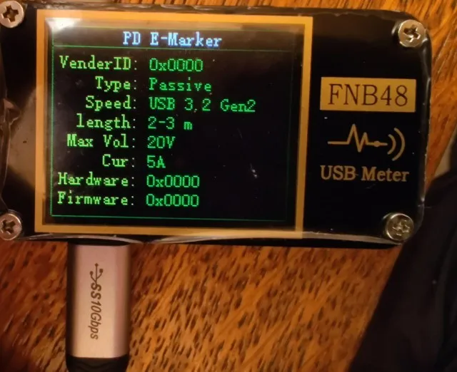 Доставка заняла чуть более 2х недель. Кабель полность соответствует описанию: это действительно USB 3.2 gen 2, видеосигнал в 4к и 60кадр/с также проходит. E-Marker есть, фотки с USB-тестера также прилагаю. При 65Вт (20В и 3,2А) нагрева не заметил. Кабель довольно твердый с плотной оплёткой, но и экранировка надёжная. Думаю брать можно, магазину успехов!