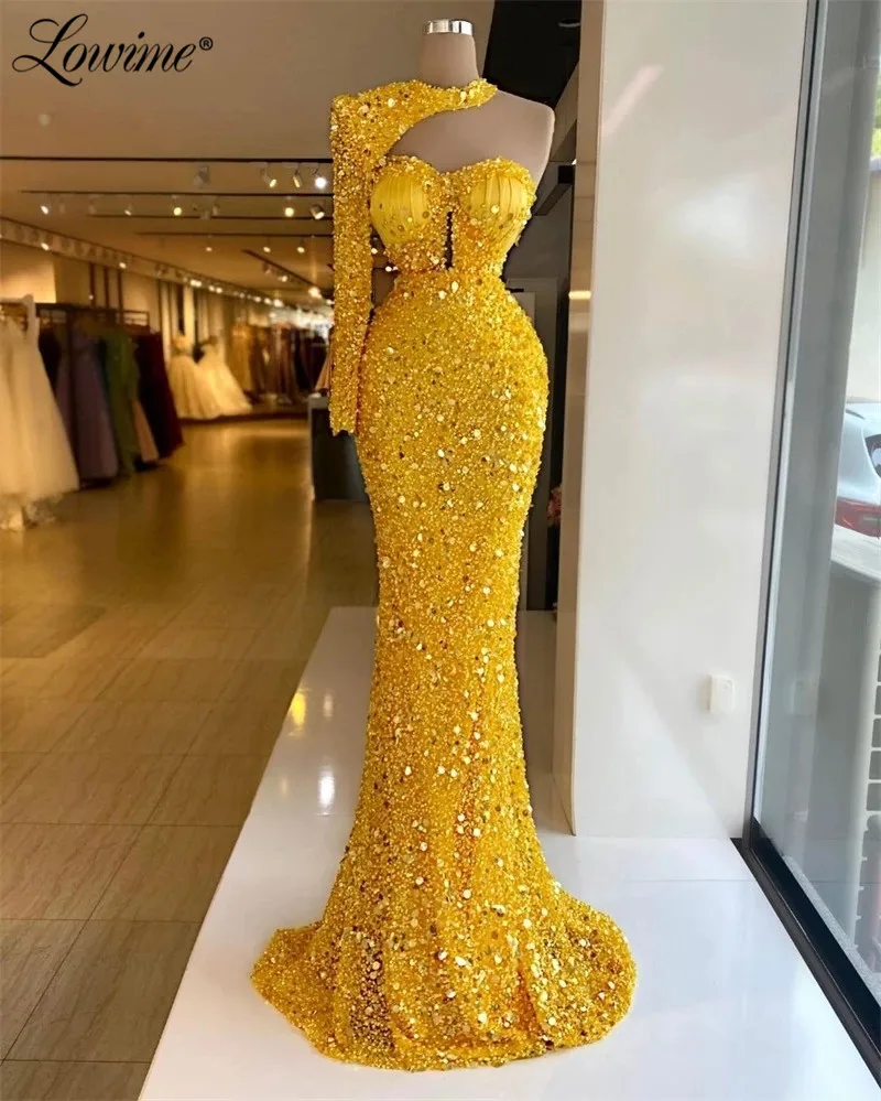 Женское платье на одно плечо Lowime, желтое платье с блестками и бусинами, вечернее платье в арабском стиле Дубая, платье для выпускного вечера, 2021
