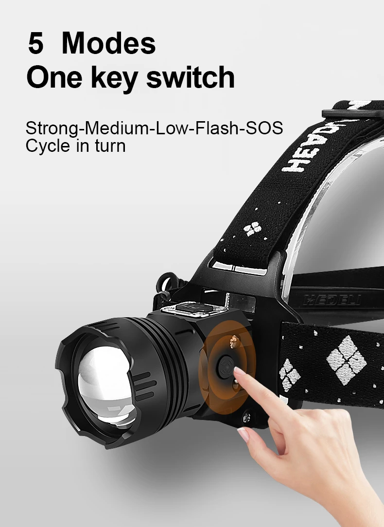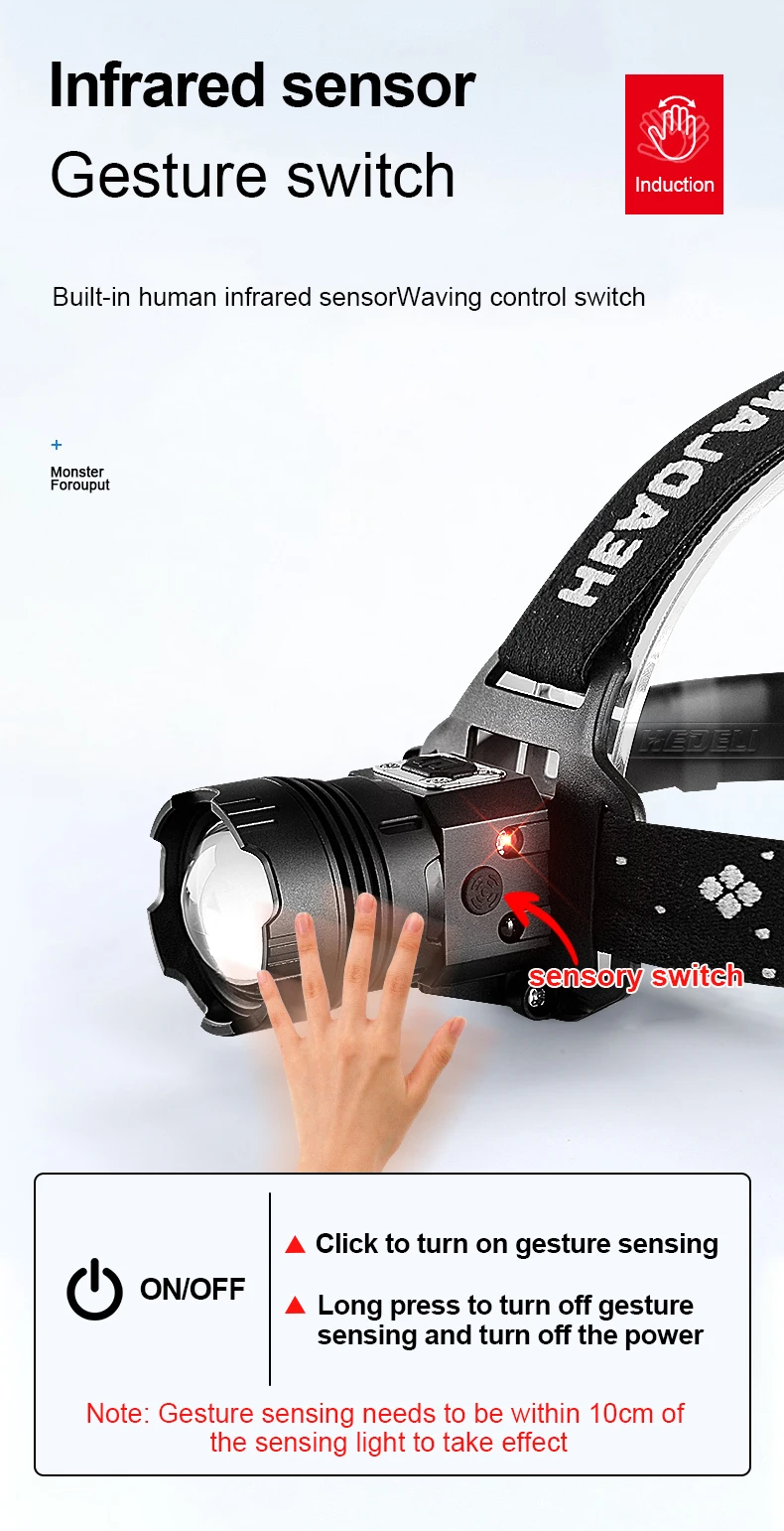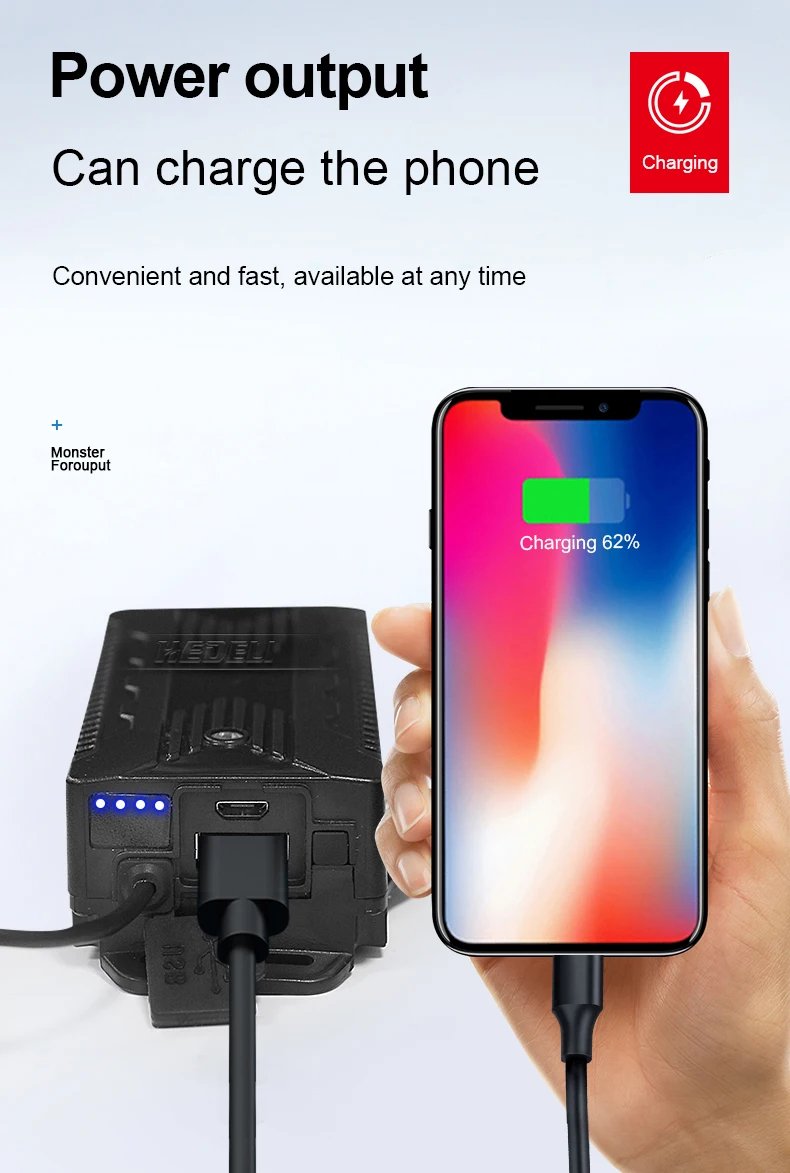 Особенности продукта1: Встроенный аккумулятор большой емкости, длительный срок службы батареи.2: IPX6 Водонепроницаемый, может использоваться в дождливые дни.3: быстрая зарядка через USB, полная зарядка в течение 5 часов.4: телескопический зум, может адаптироваться к любому случаю.5: дисплей питания, дайте вам знать состояние питания в любое время.6: функция мобильного питания, может полностью заряжать телефон 5 раз.7: функция инфракрасного датчика, переключатель дистанционного управления.