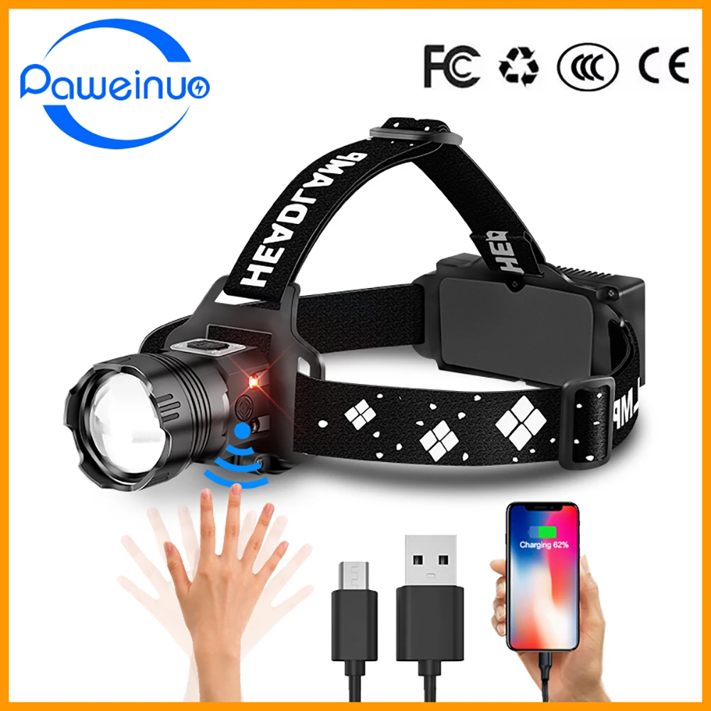 Paweinuo Мощный светодиодный налобный фонарь 18650, перезаряжаемый мощный яркий налобный фонарь, Usb налобный фонарь с датчиком, водонепроницаемый налобный фонарь для рыбалки