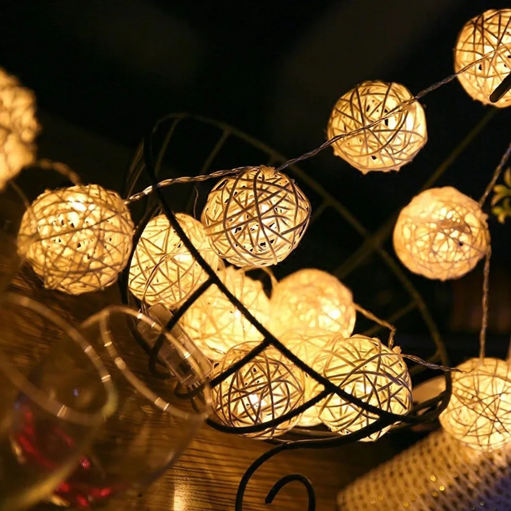 Светодиодная гирлянда с шариками из ротанга, гирлянда на батарейках, Сказочная гирлянда, украшение вечерние, праздничное рождественское освещение на Новый год 2022
