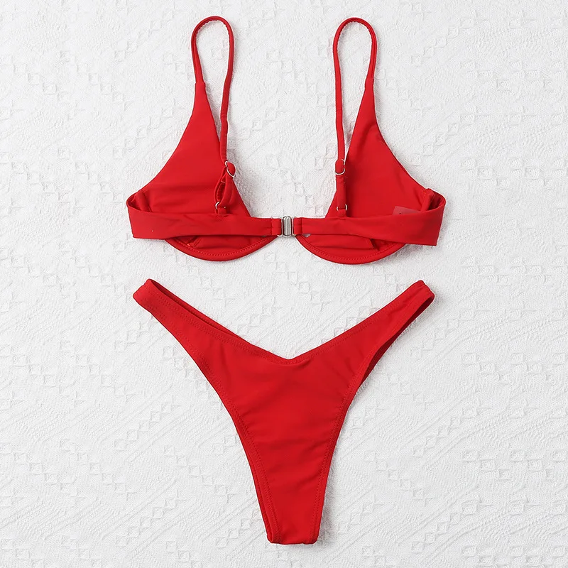 Сексуальное бикини на косточках, 2021, Женский однотонный красный купальник с пуш-ап, треугольный купальник, haler, v-образный вырез, купальный костюм, Мини, микро стринги, купальник