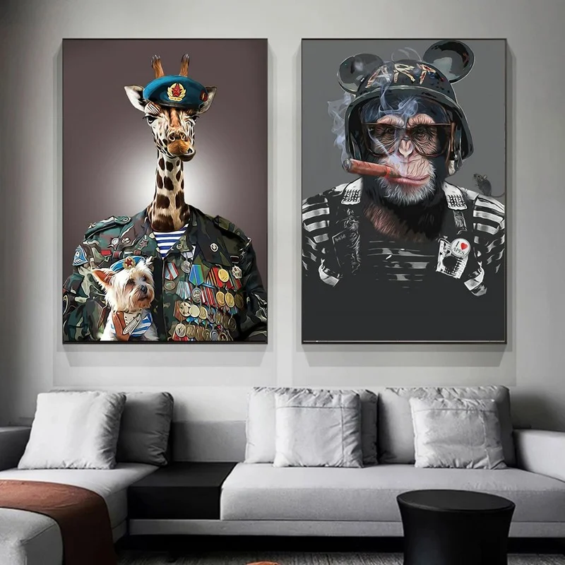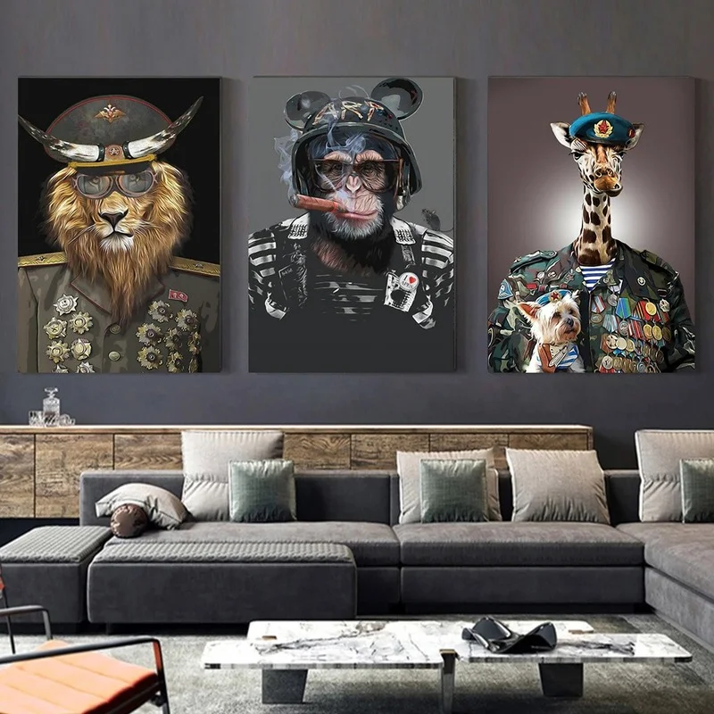 Классическая Картина на холсте с изображением Льва обезьяны жирафа в военной униформе