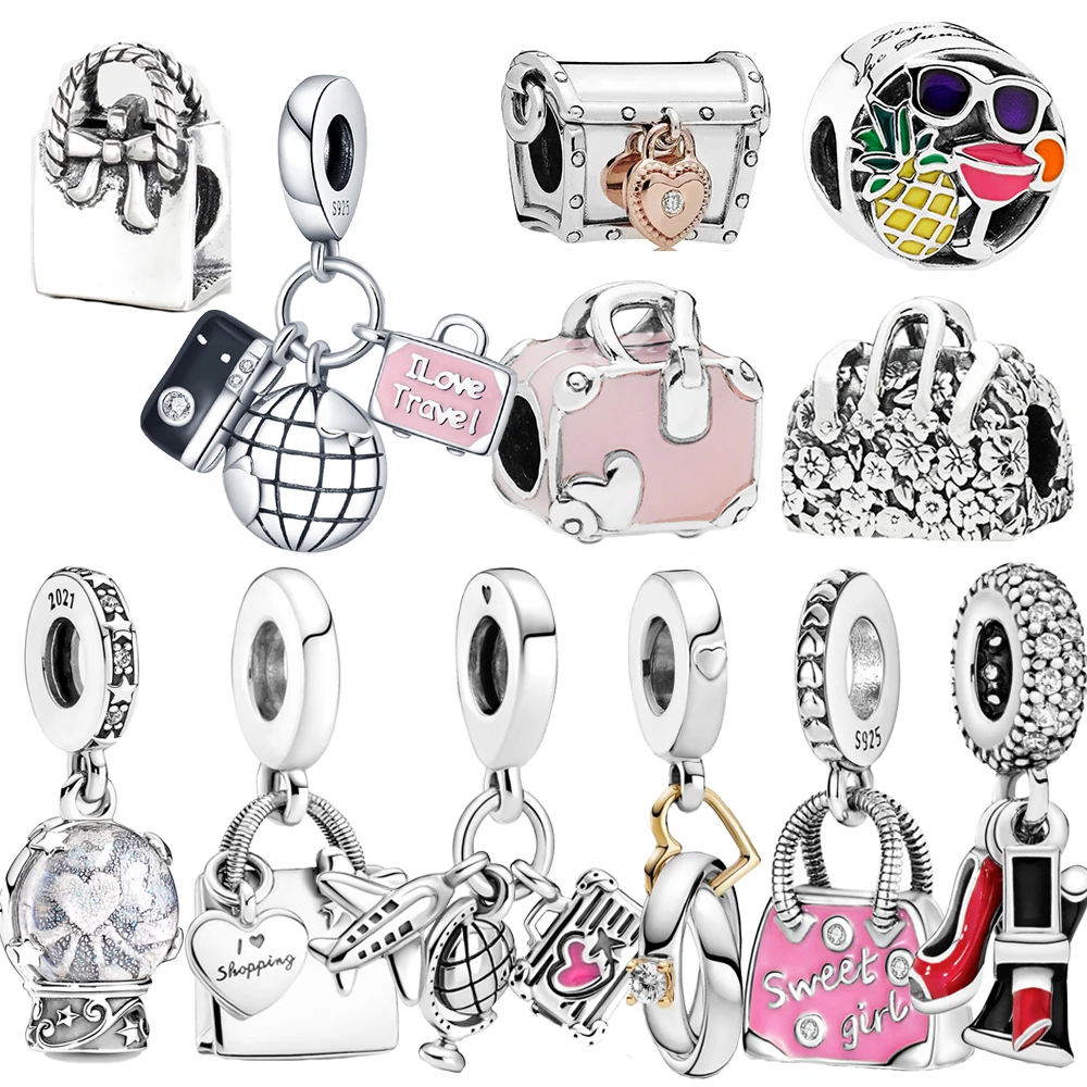 Подвеска-Шарм для самолета, глобуса и чемодана из серебра 100% пробы, розовая дорожная сумка для покупок, Шарм подходит для браслета Pandora, подарок