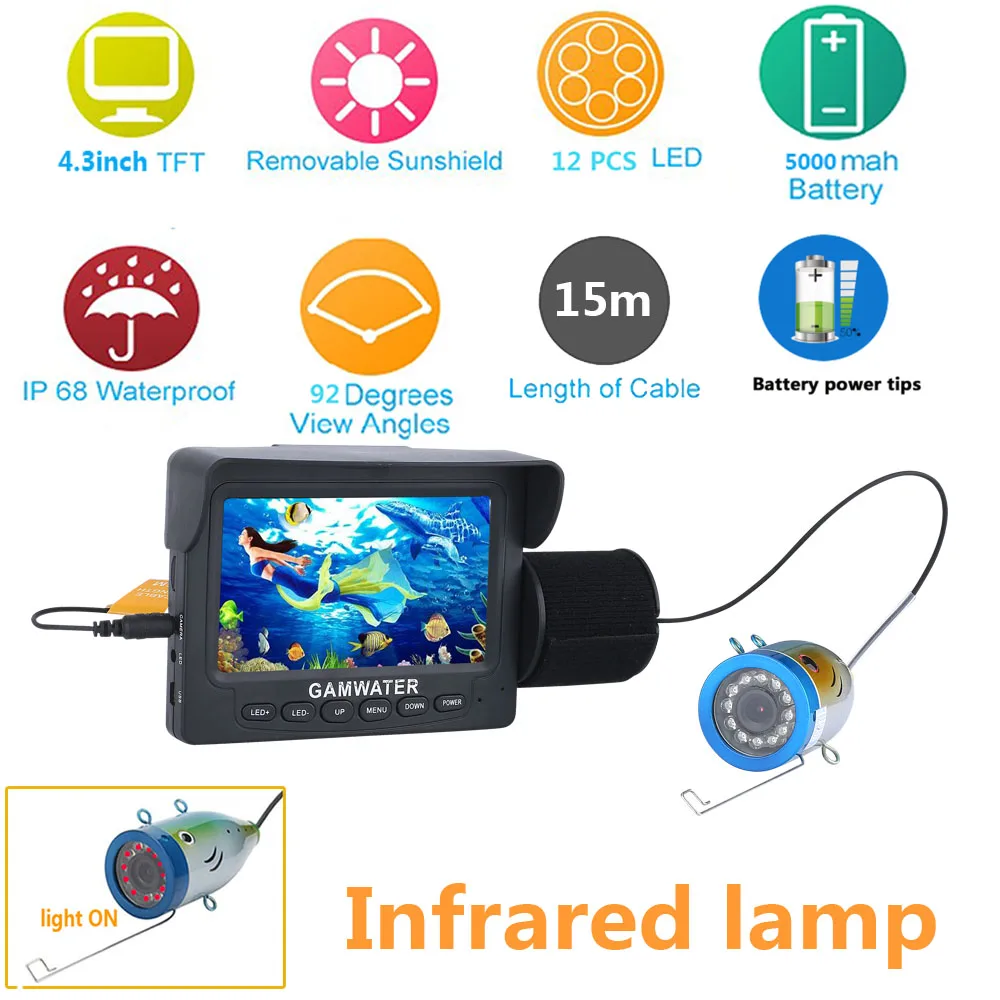 Датчик изображения: датчик CMOSIP68 водонепроницаемыйУгол обзора: 92 градусовВидимое расстояние (чистая вода): 1-3 мНочное видение: 12 шт. ИК-светодиодовКамера: 1000TVL/алюминиевый сплавАккумулятор: 5000AHПродолжительное время использования аккумулятора: около 4 часов