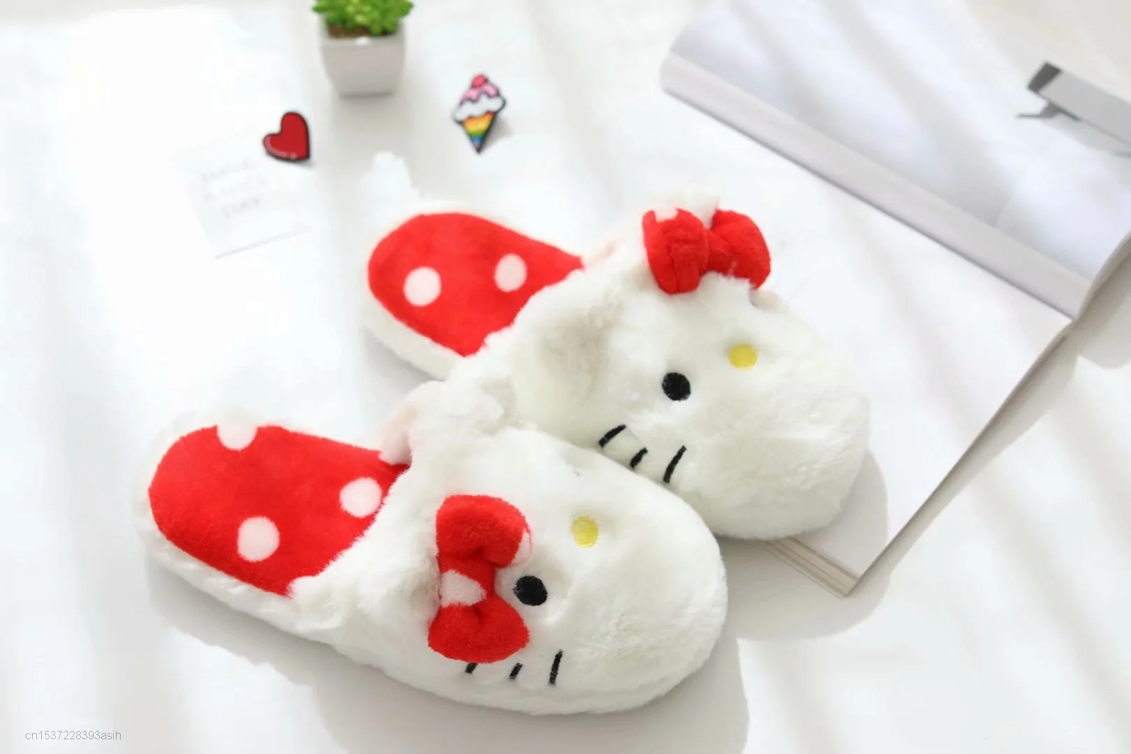 Sanrio, Hello Kitty Kuromi Cinnamoroll My Melody зимние меховые плюшевые тапочки на плоской подошве для женщин женская обувь слайдер кавайные домашние тапочки