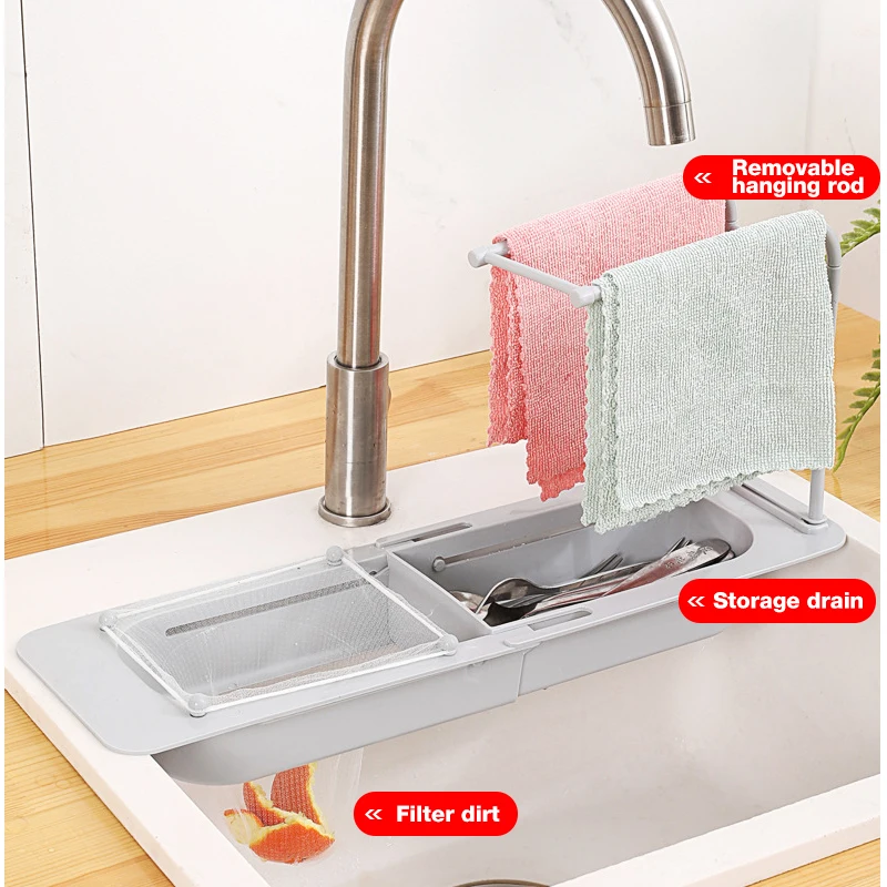 Масштабируемый дизайн:Стойка для хранения раковины имеет удобный и масштабируемый дизайн для удовлетворения ваших различных потребностей, адаптируется к различным размерам раковины и может свободно регулировать длину. Продукт имеет большую емкость для хранения. Мы используем дизайн стойки для полотенец, чтобы высушить полотенца для вас, экономя пространство вашей кухни и уменьшая ощущение размещения полотенец. (расширяемая длина: 43 см).