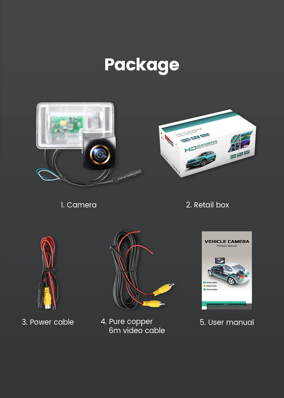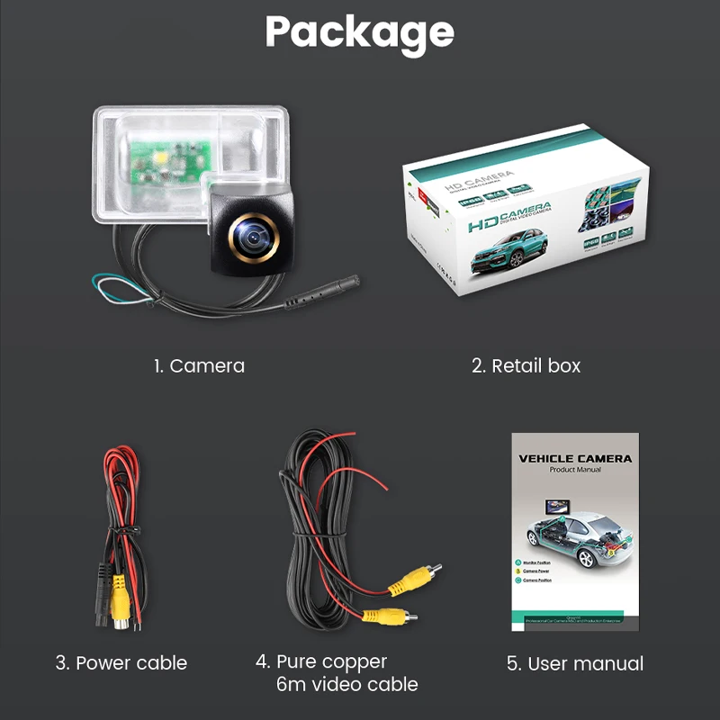 1. Камера заднего вида2. Розничная коробка3. Кабель питания4. Видеокабель из чистой меди 6 м5. Руководство пользователя