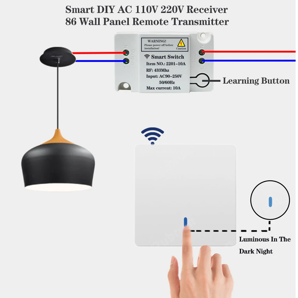 Настенный выключатель Rubrum 433 МГц, беспроводной, RF 86, настенная панель, передатчик + AC 110 В 220 В, светодиодный лейный приемник, кнопка питания Светильник щения
