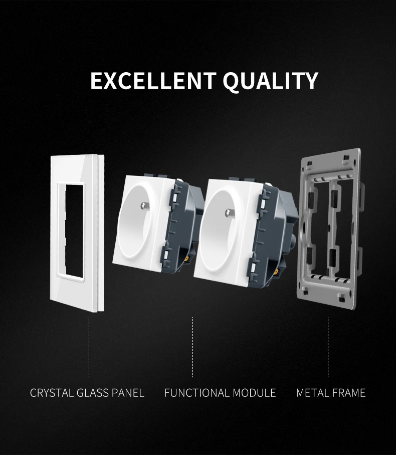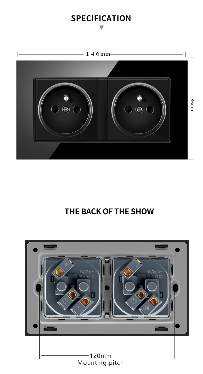 . С 1 или двойным французским модулем гнезда2. Номинальное напряжение (ы): 100 ~ 250 В переменного тока/50 ~ 60 Гц3. Номинальный ток: 16A4. Обеспечение заземления: с заземлением5. Степень защиты от электрического удара: с повышенной защитой6. Тип клемм: встроенный тип винтов7. Размер: 146 мм x 86 мм8. Цвет: белый/черный/шампанское золотой/серый9. Материал панели: закаленное Хрустальное стекло10. Стандарт гнезда: Европейский или французский стандарт Schuko