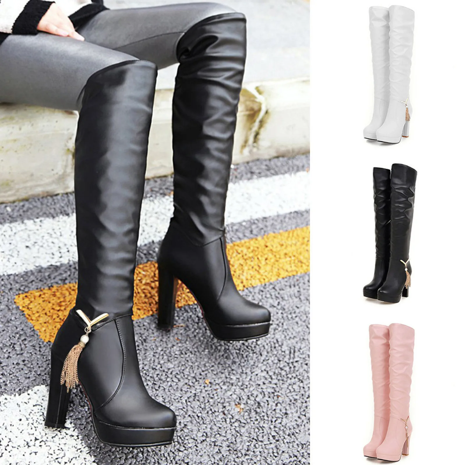 Женские высокие сапоги до колена, кожаные однотонные сапоги на высоком каблуке 11 см, осенне-зимние сапоги с круглым носком, Винтажная обувь, сапоги, 2021