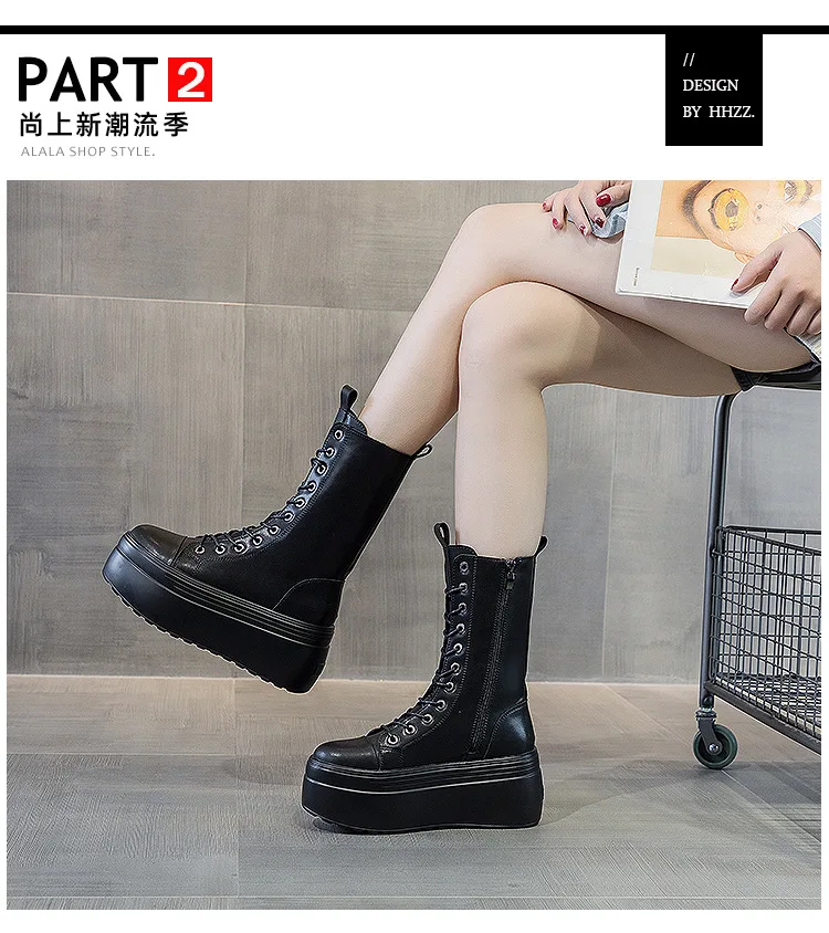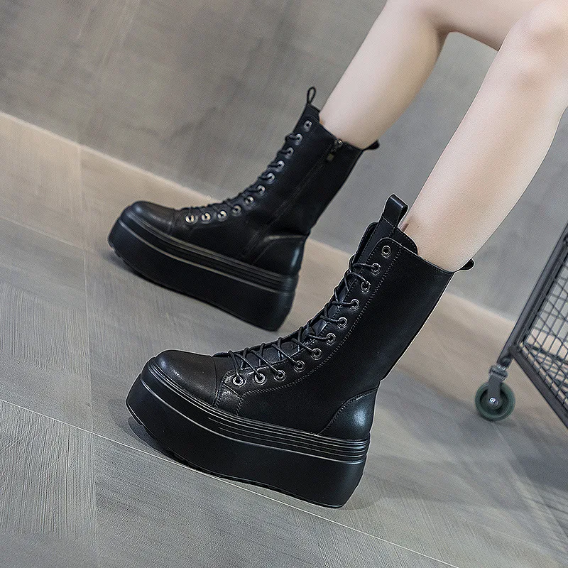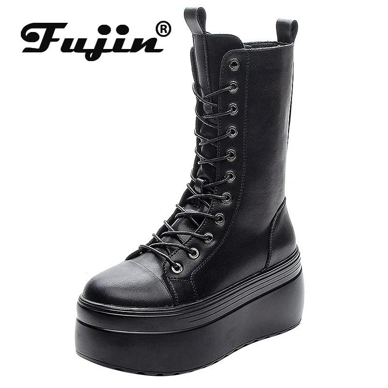 Сапоги кожаные до середины икры Fujin, черные сапоги до середины икры на толстой подошве, с застежкой-молнией, весна-осень 2021