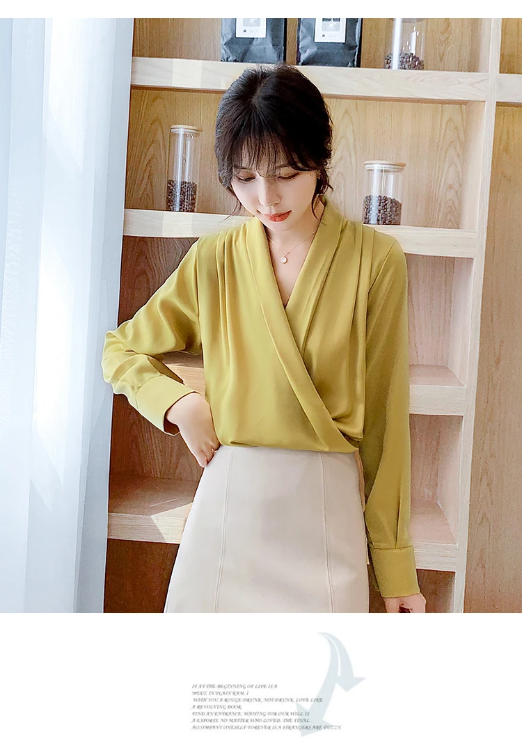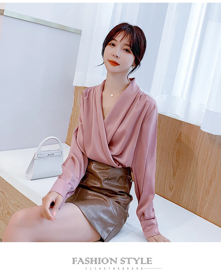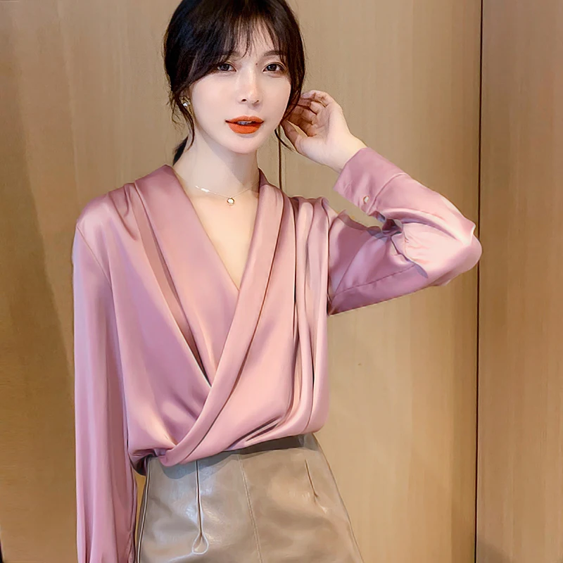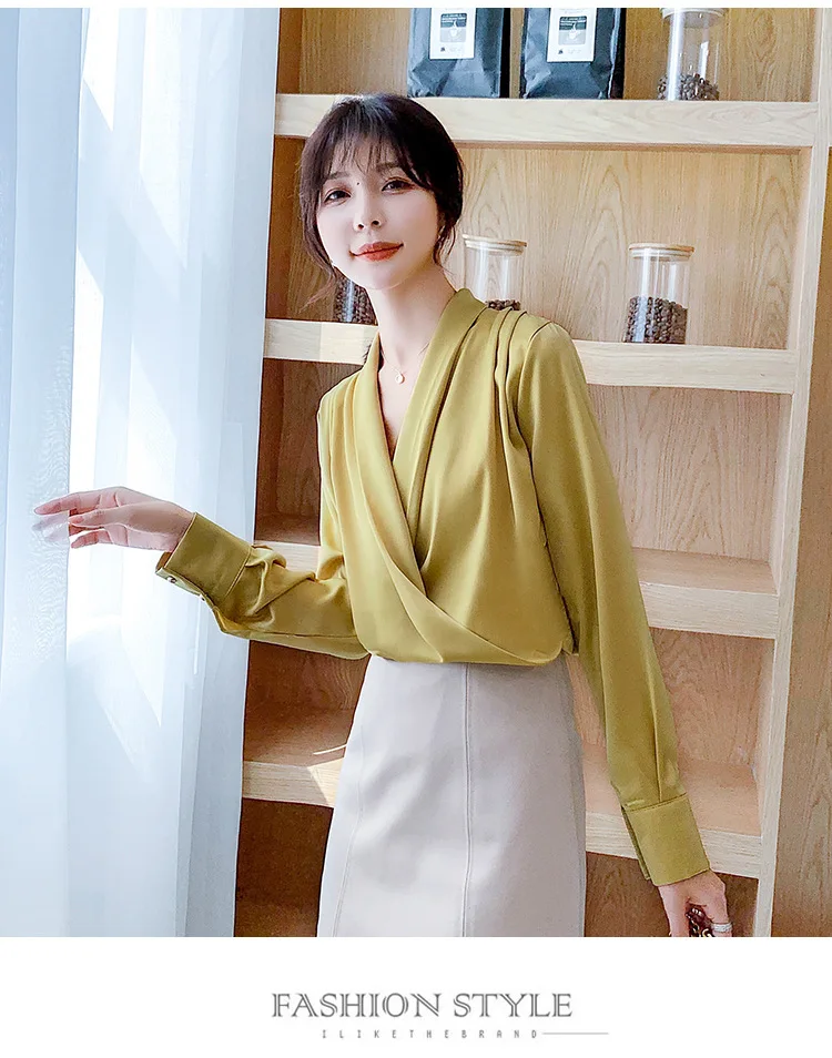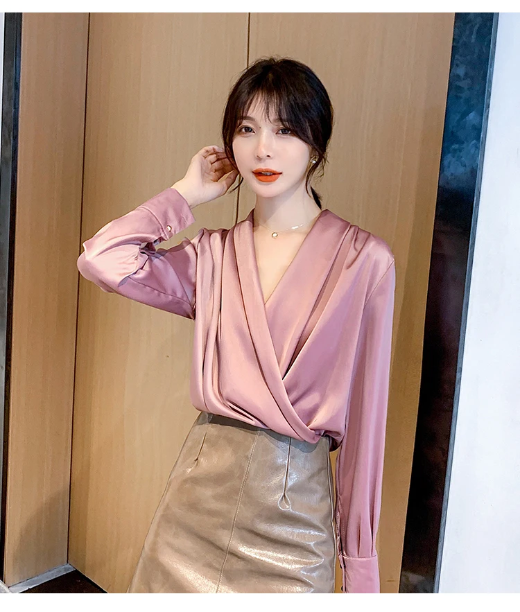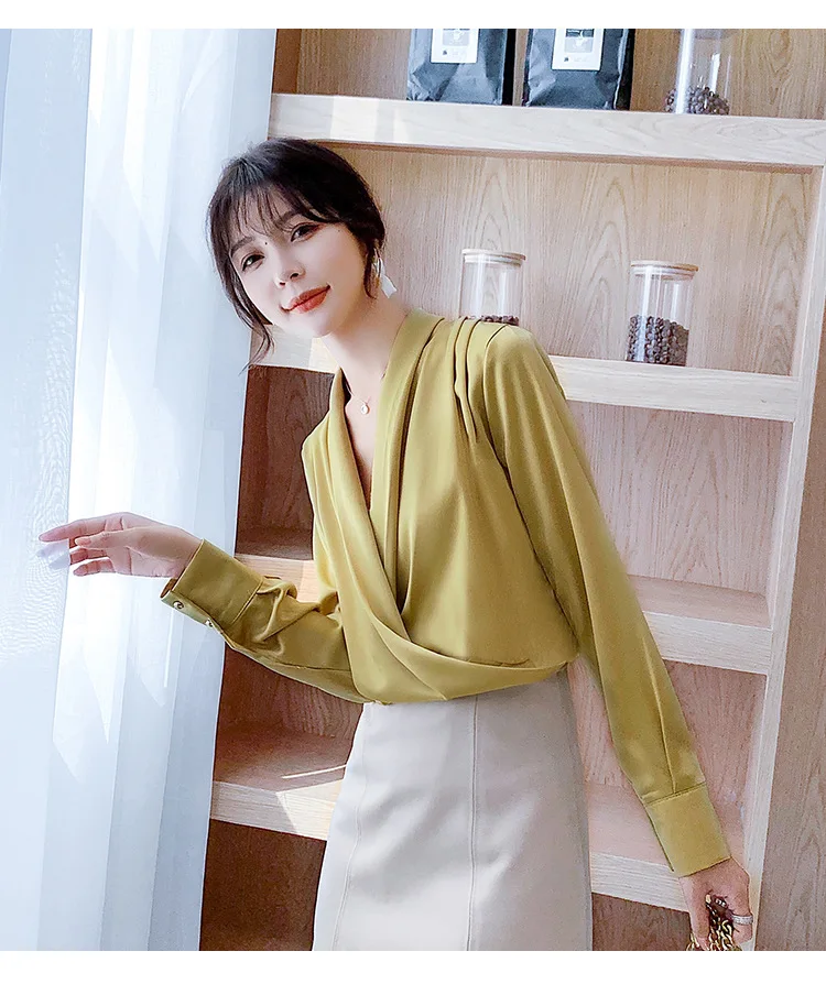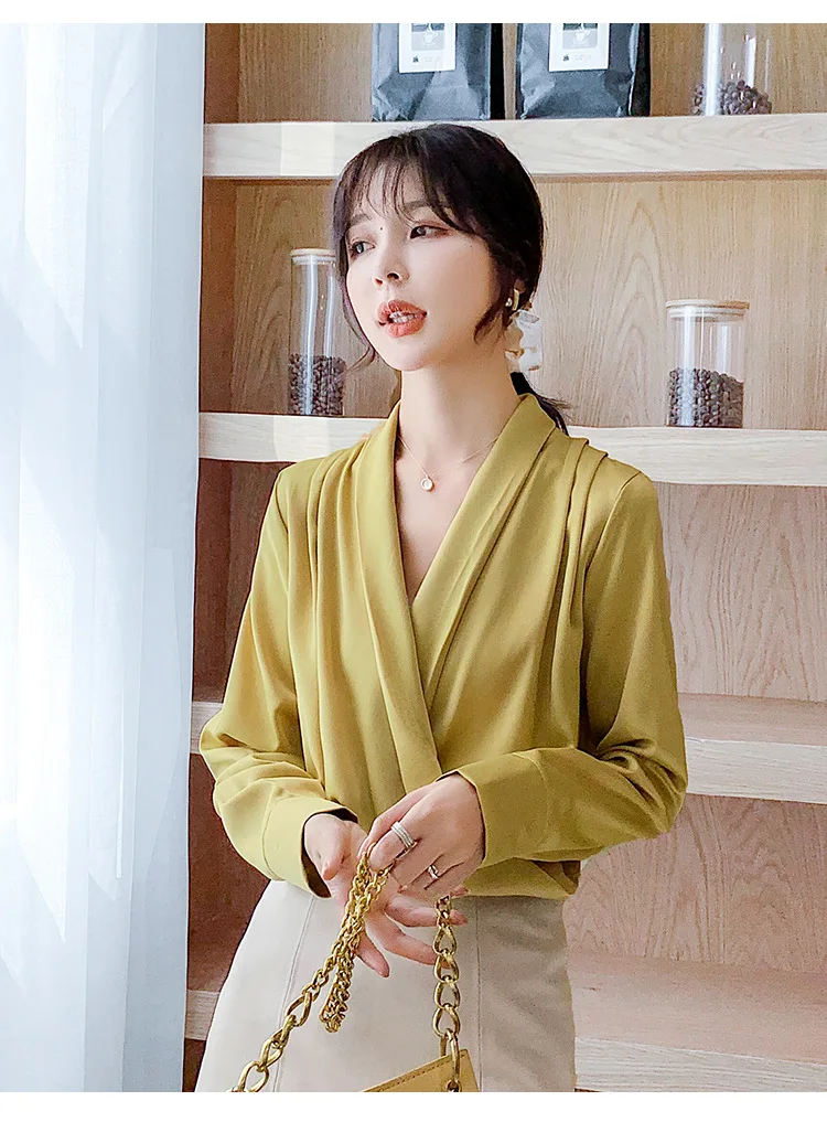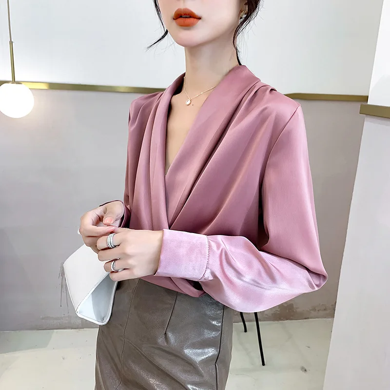 Женская атласная блузка из натурального шелка, дизайнерская рубашка-шаль, элегантный офисный топ с V-образным вырезом и длинным рукавом, однотонный Роскошный Шикарный топ