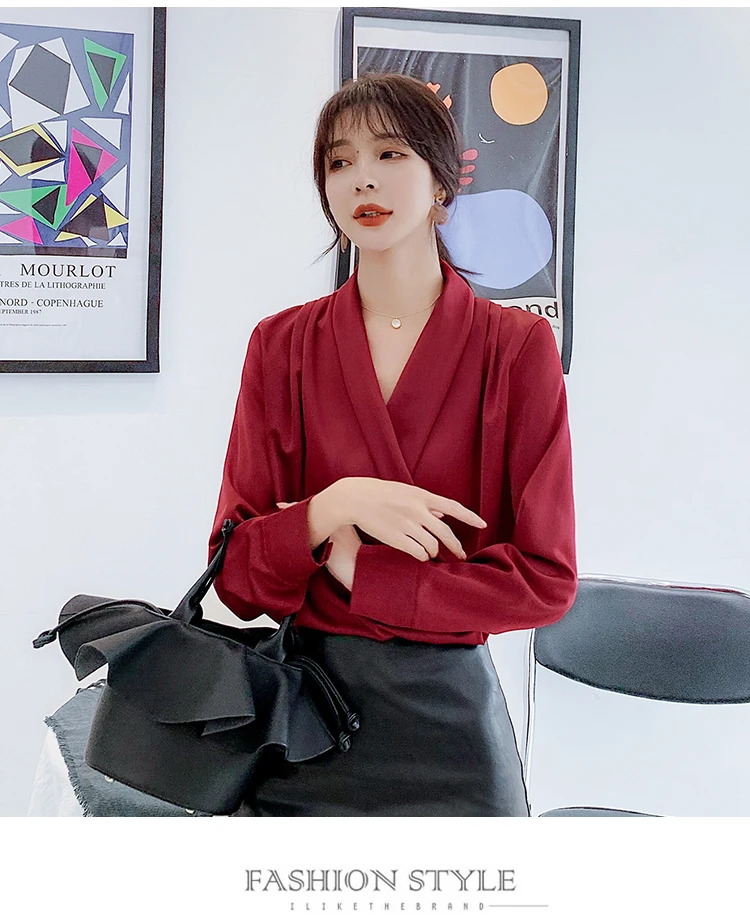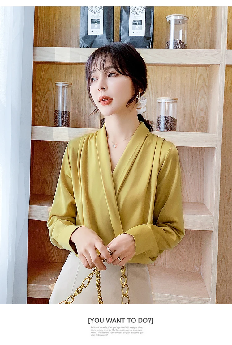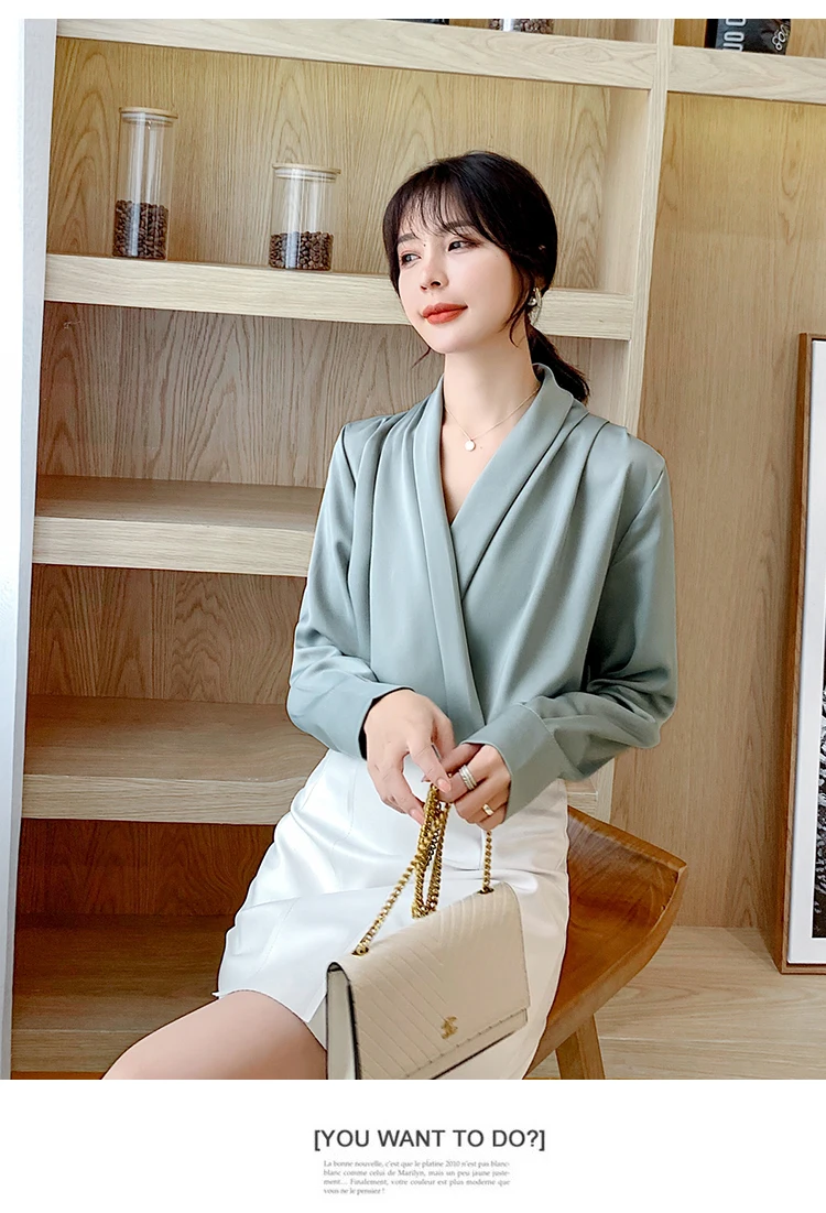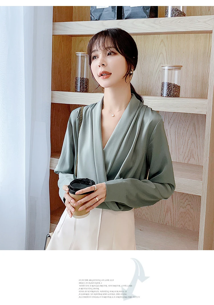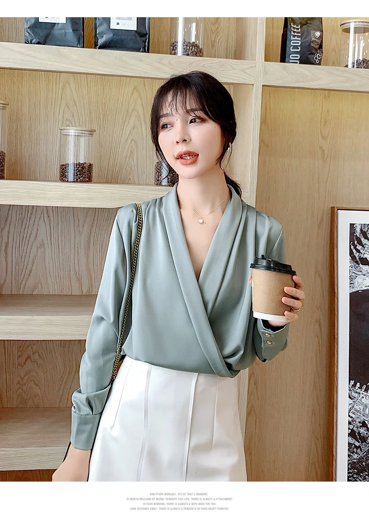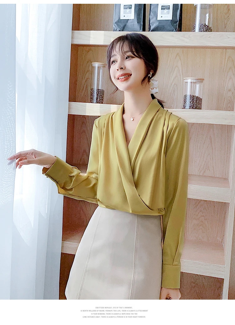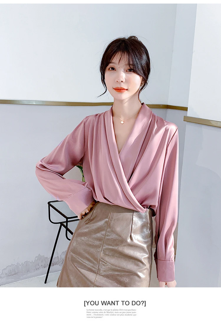 Женская атласная блузка из натурального шелка, дизайнерская рубашка-шаль, элегантный офисный топ с V-образным вырезом и длинным рукавом, однотонный Роскошный Шикарный топ