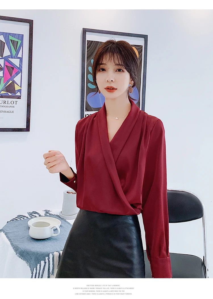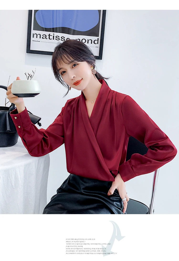 Женская атласная блузка из натурального шелка, шаль, дизайнерская рубашка размера плюс, офисная, элегантная, с v-образным вырезом, качественная, с длинным рукавом, однотонная, роскошная, шикарная, Топ