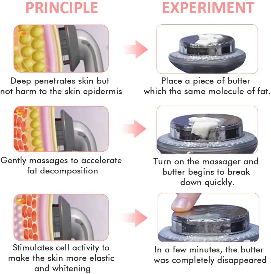 2)Ультразвуковой имеет три основные функции:➀Он может изменить емкость и движение каждой клетки с точной функцией массажа, которая называется массажем клеток.