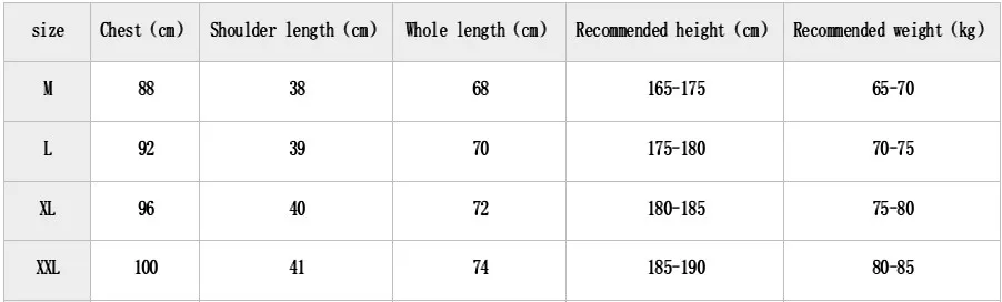 Примечание: 1. Мы профессионально продаем мужскую одежду. 2. Мы предоставляем высококачественную продукцию 3. Вы будете покупать напрямую с китайского завода 4. Если вы хотите купить большое количество, отправьте нам электронное письмо, и мы предложим вам лучшую цену! 5. Если ваши мерки колеблются между двумя размерами, советуем выбрать больший размер. 6. Так как у каждого человека разный тип тела, если вы не уверены, какой размер выбрать, пожалуйста, свяжитесь с нами!