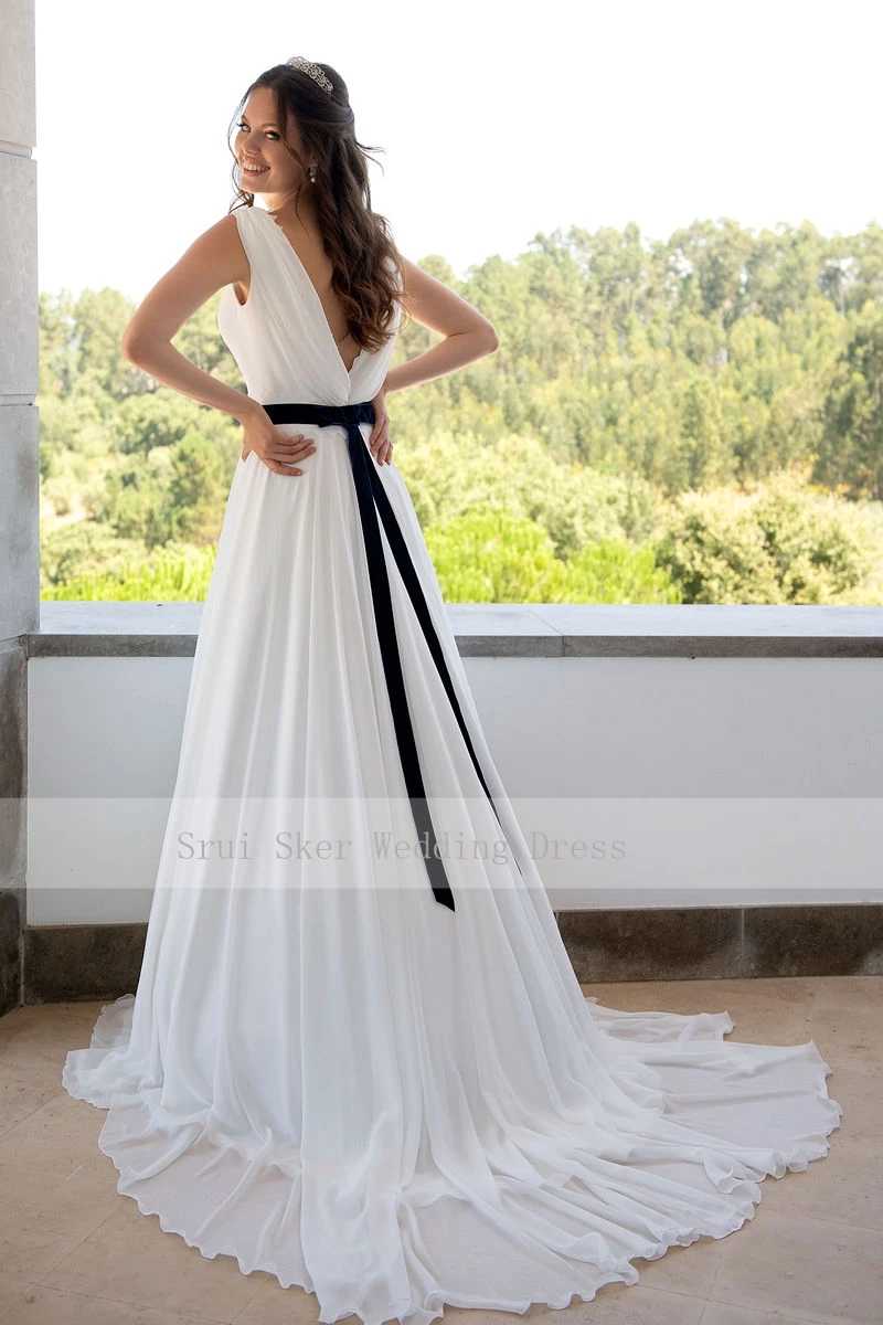 Шифоновое свадебное платье-трапеция без рукавов, с глубоким V-образным вырезом и черным поясом, простые свадебные платья, robe de mariee sirene