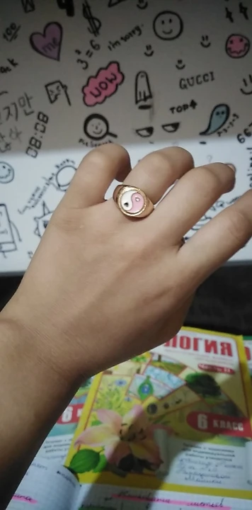 Милое колечко, пришло быстро, но так же быстро потемнело, так что если собираетесь носить-то сразу скройте его бесцветным лаком