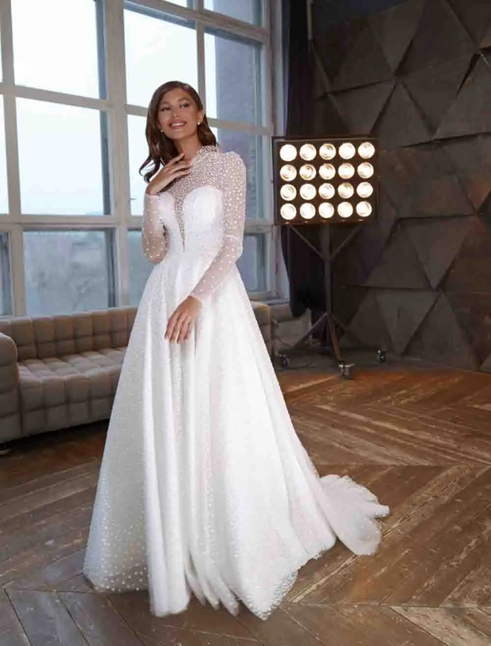 Свадебное платье Sevintage, мусульманское ТРАПЕЦИЕВИДНОЕ, с высоким воротом, длинным рукавом, в горошек