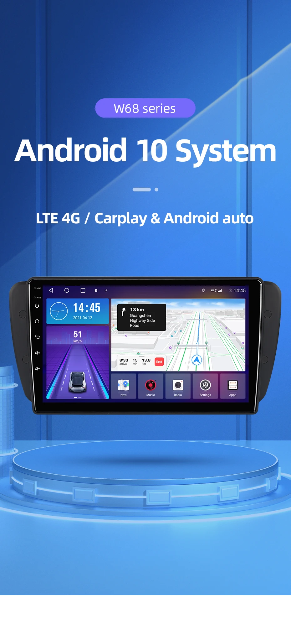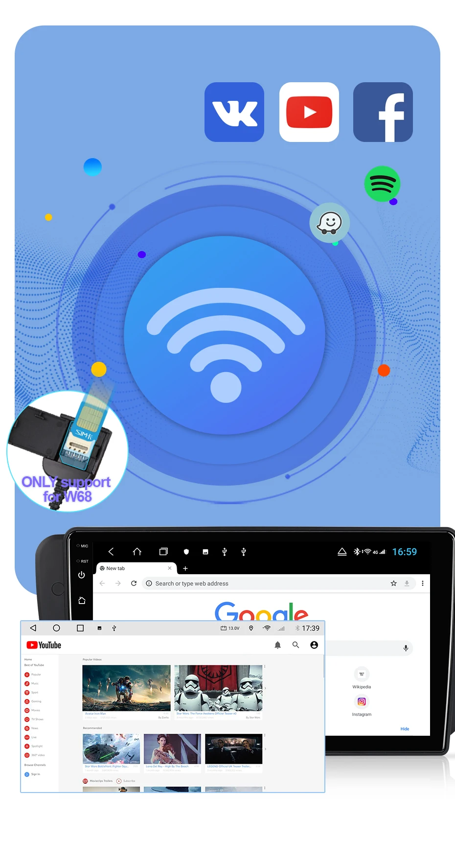 Пожалуйста, обратите внимание: только w68 поддерживает сеть 4G (sim-карта не входит в комплект)>>> Подключите свой автомобильный радиоприемник к Wi-Fi и можете использовать его как телефон, загрузите приложение из игрового магазина, которое вам нравится.