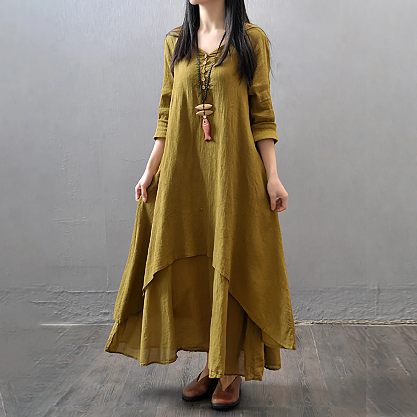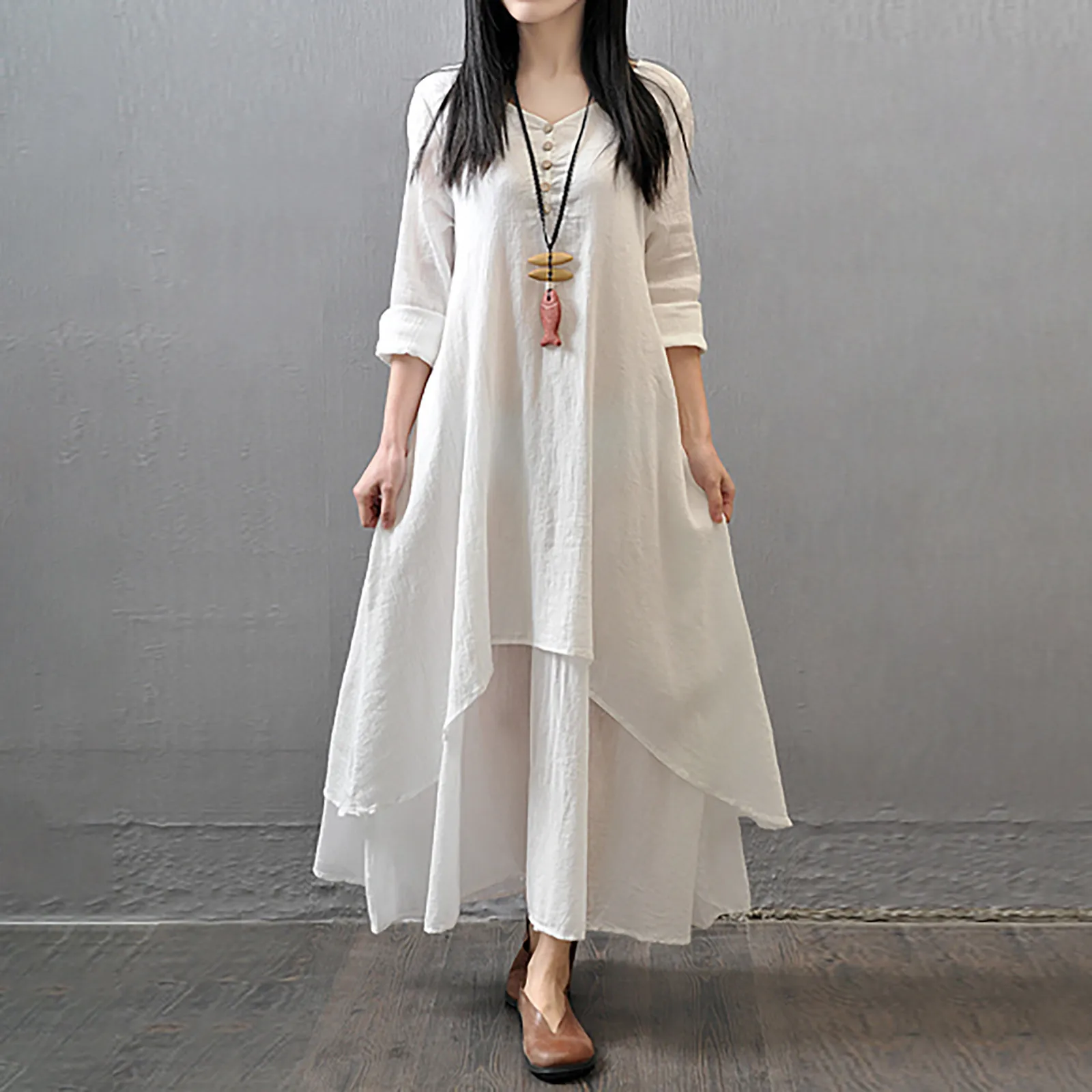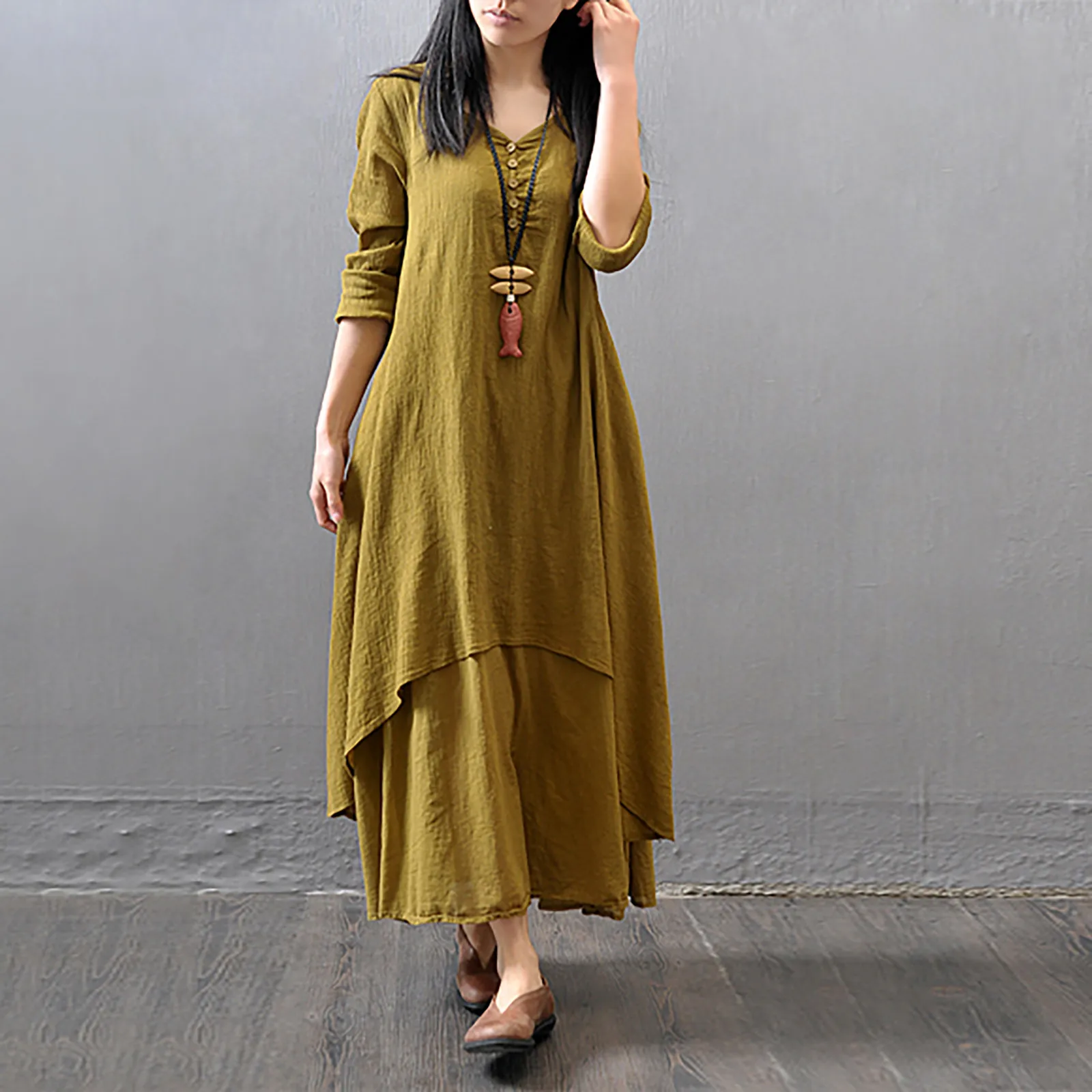 2021 весеннее женское платье в стиле бохо с v-образным вырезом, этническое хлопковое льняное платье макси, повседневное асимметричное длинное платье с длинным рукавом и пуговицами, хит продаж