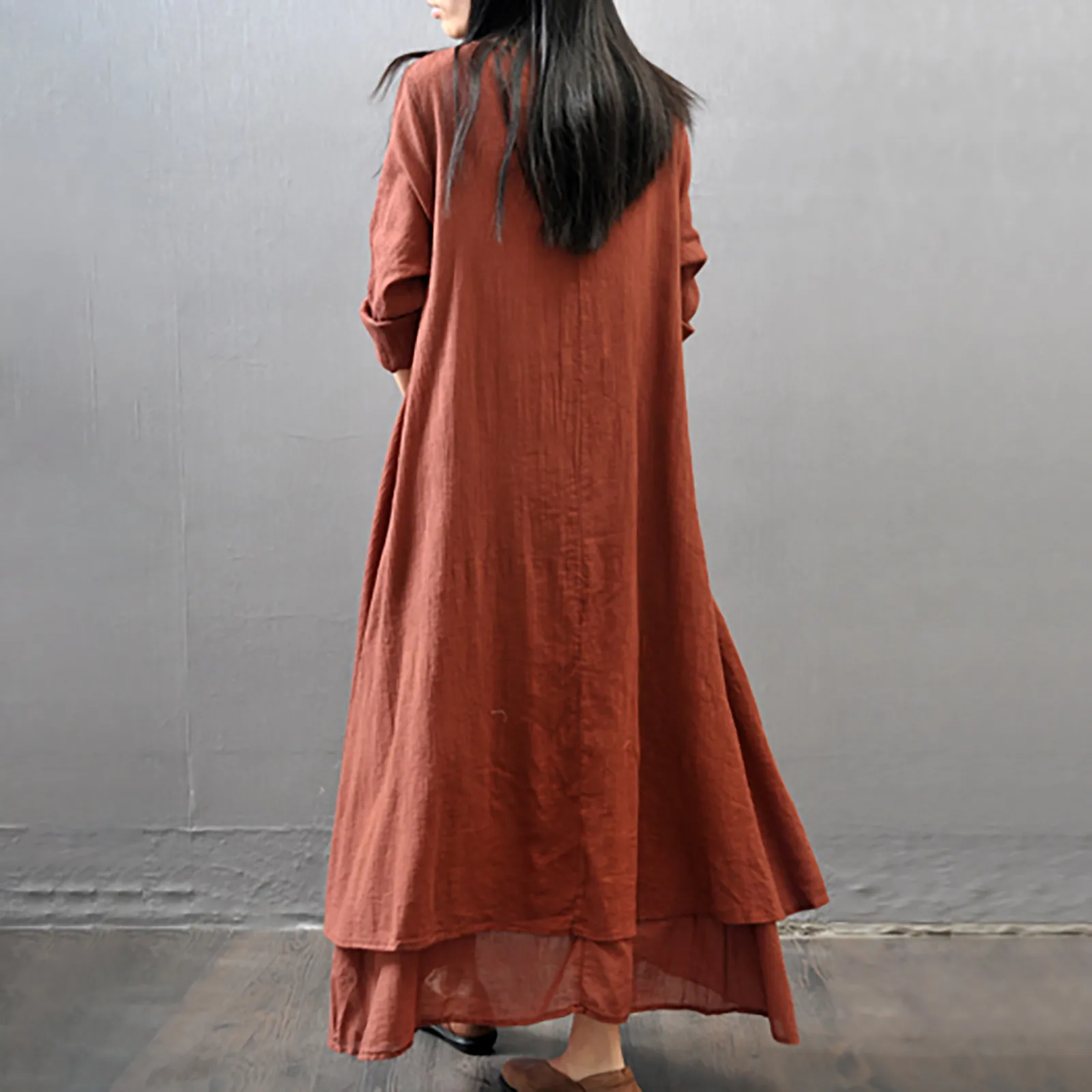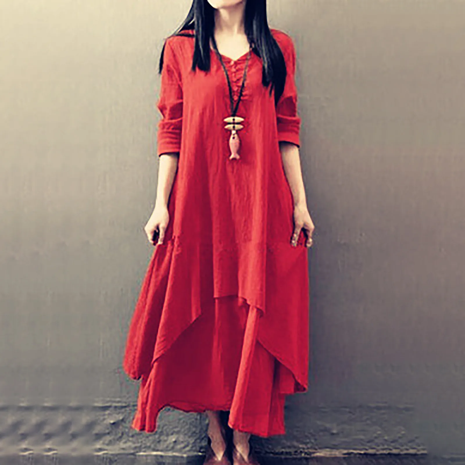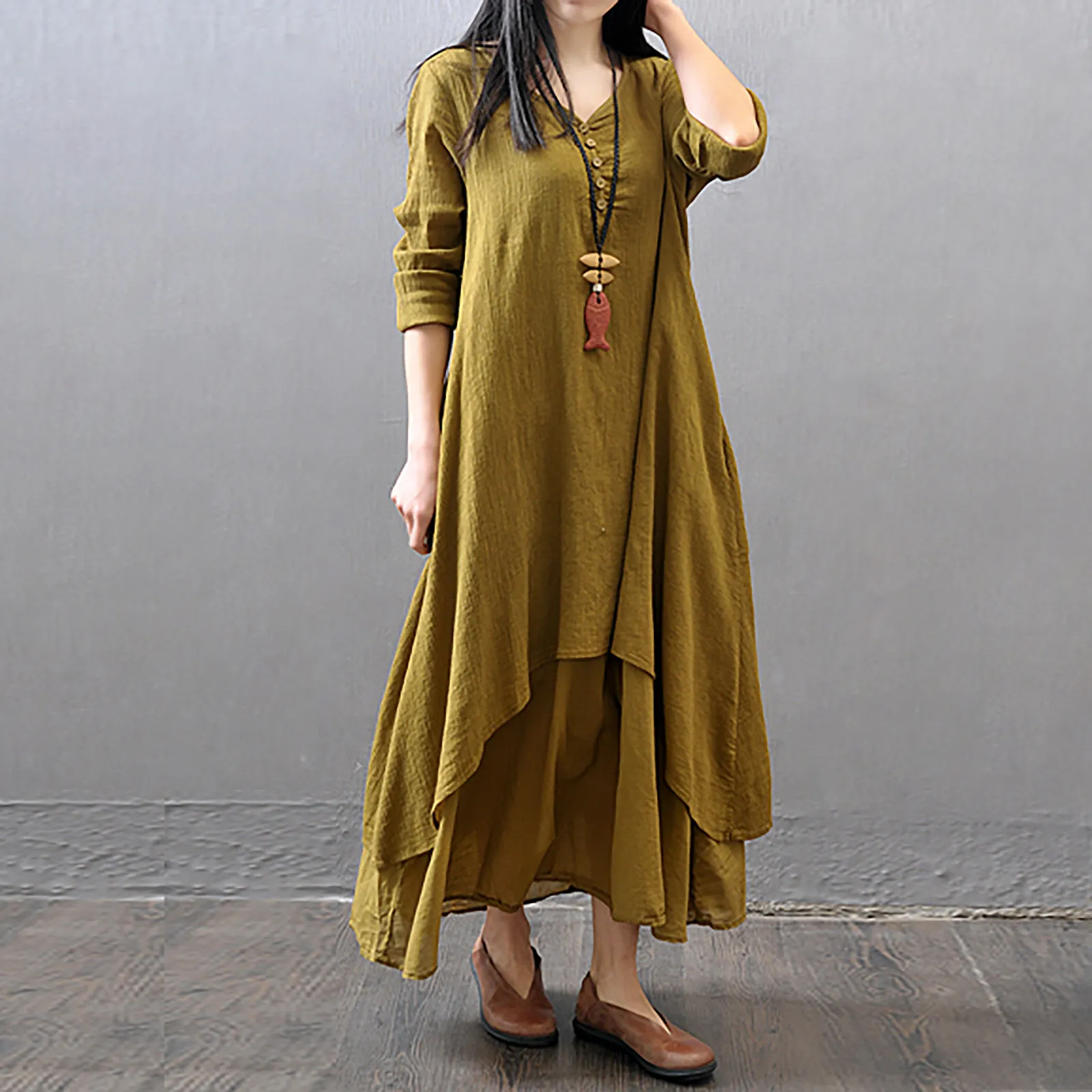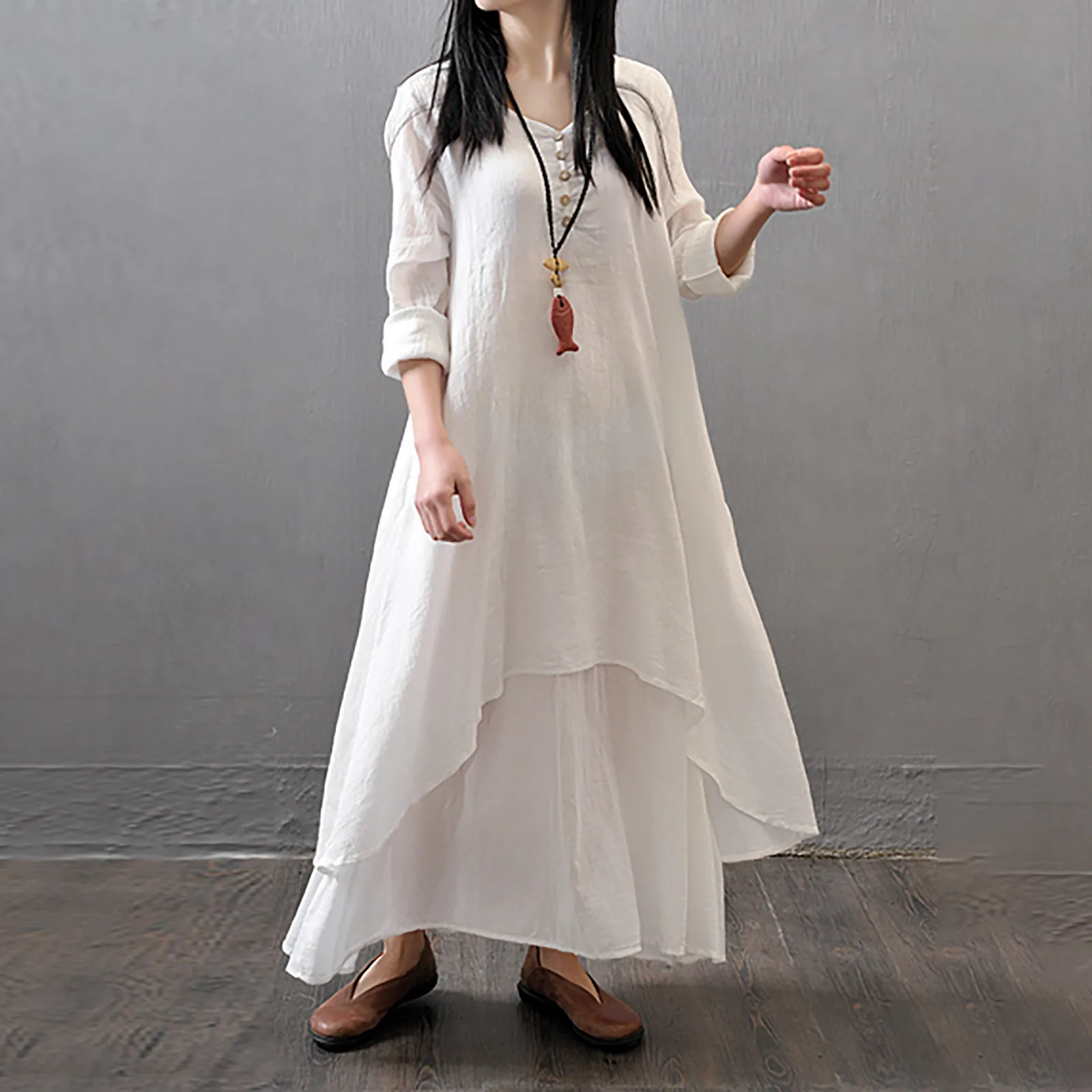 2021 весеннее женское платье в стиле бохо с v-образным вырезом, этническое хлопковое льняное платье макси, повседневное асимметричное длинное платье с длинным рукавом и пуговицами, хит продаж