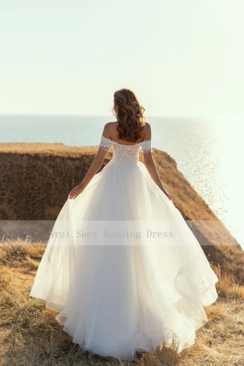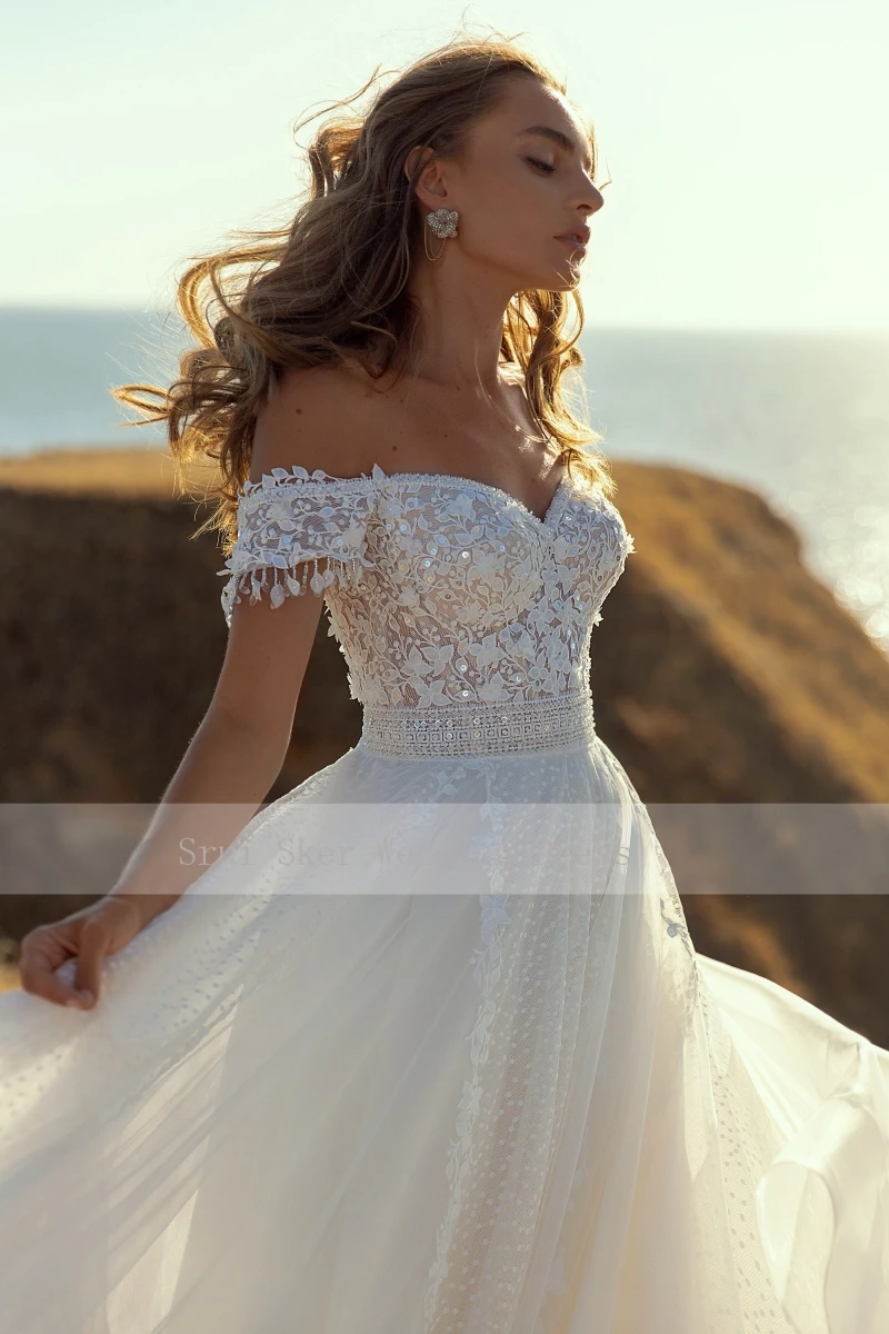 Платье свадебное с открытыми плечами и короткими рукавами