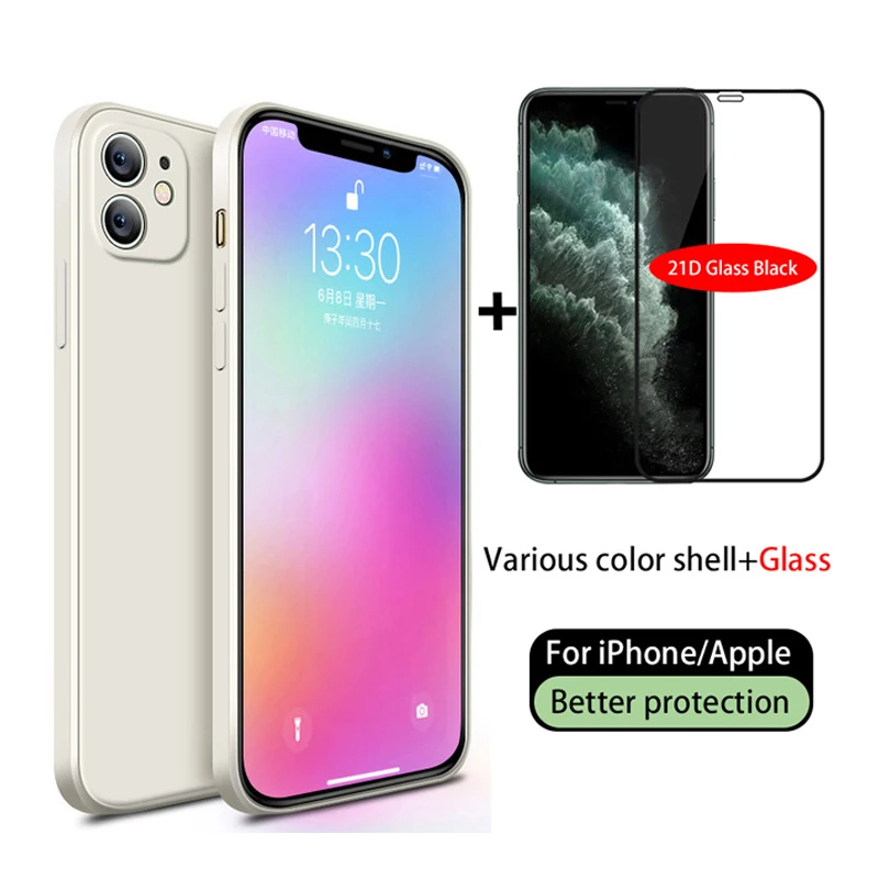 Роскошный чехол из жидкого силикона, закаленное стекло для iPhone 12 11 Pro Max Mini X XR XS 7 8 6s Plus SE 2020, противоударный мягкий чехол, 128 ГБ