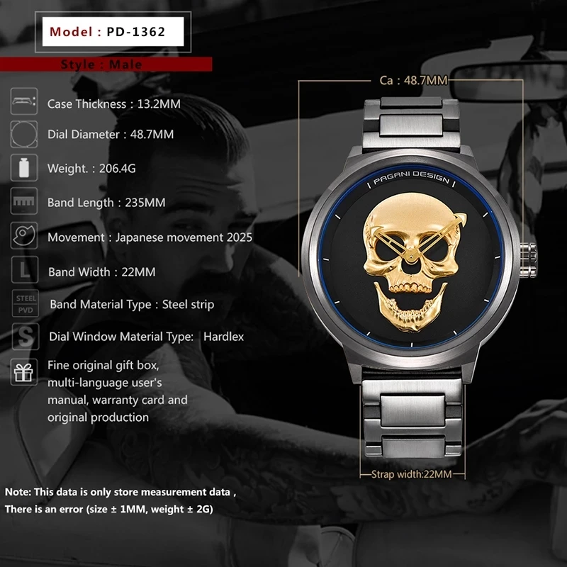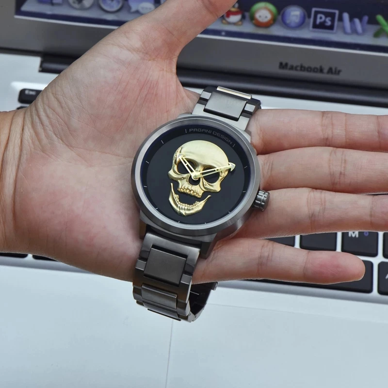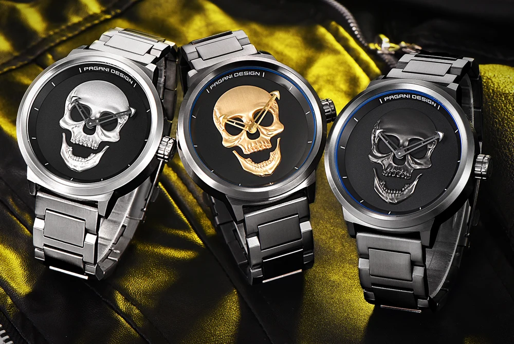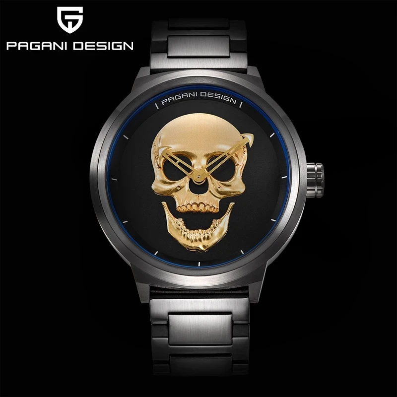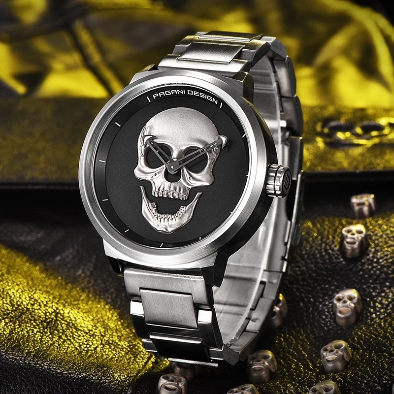 Часы PAGANI DESIGN Мужские кварцевые в стиле панк, модные водонепроницаемые в ретро стиле, с 3d-изображением черепа, нержавеющая сталь, 30 м