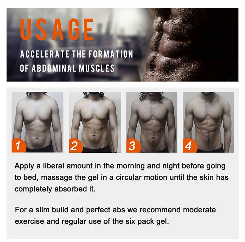 Ускоряет формирование мышц животаНанесите свободное количество утром и ночью перед сном, массируйте гель круговым движением до полного впитывания кожи.Для тонкой сборки и идеального abs мы рекомендуем умеренные упражнения и регулярное использование шести упаковочных гелей.