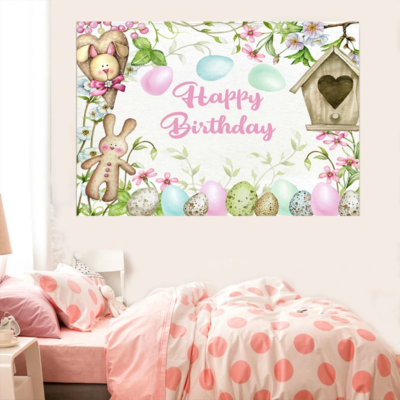 Фон для фотосъемки детей на день рождения с изображением милого кролика пасхальных яиц, декор для детской вечеринки, цветы, птичье гнездо, персонализированный мультяшный фон