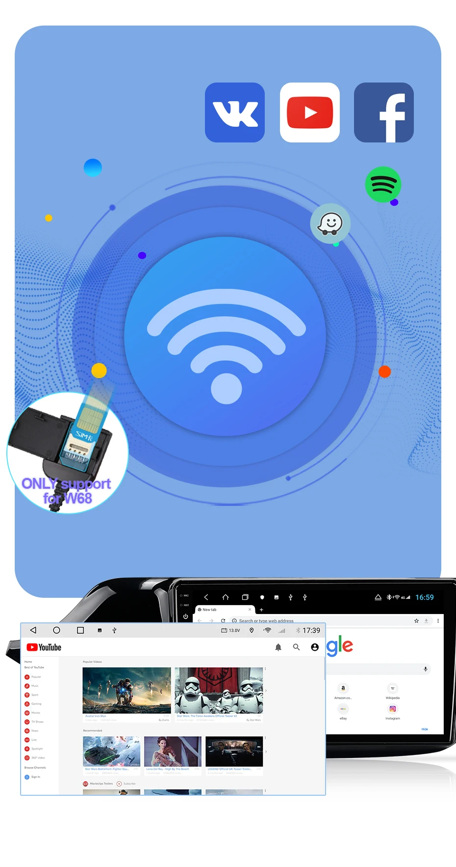 Пожалуйста, обратите внимание: только w68 поддерживает карту 4G>>> Подключите автомобильный радиоприемник к Wi-Fi и используйте его, как телефон, загрузите приложение из игрового магазина, которое вам нравится.