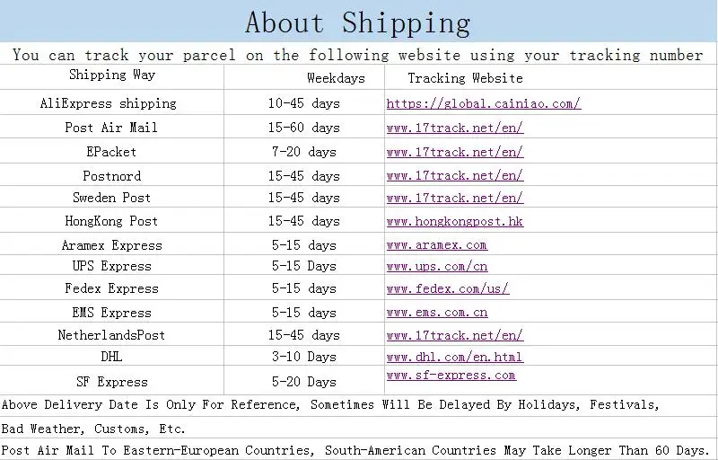 Nuestros productos utilizan la entrega exprés estandar (como ePacket, Envio estandar de AliExpress, correo aéreo postal и т. д.).